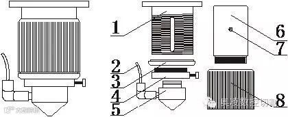 1、聚焦镜内筒 ;2、进气管; 3、限位螺圈 ;4、气嘴过渡套; 5、气嘴 ;6、镜筒 ;7、限位螺丝 ;8、调节套筒。