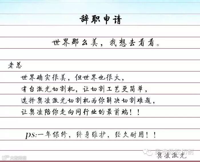 一封辞职信近来在朋友圈和微博刷屏,信中的辞职理由仅有10字:“世界那么大,我想去看看”。而今天广州奥凌则带着大家来探讨一下激光切割机技术的奥秘所在。