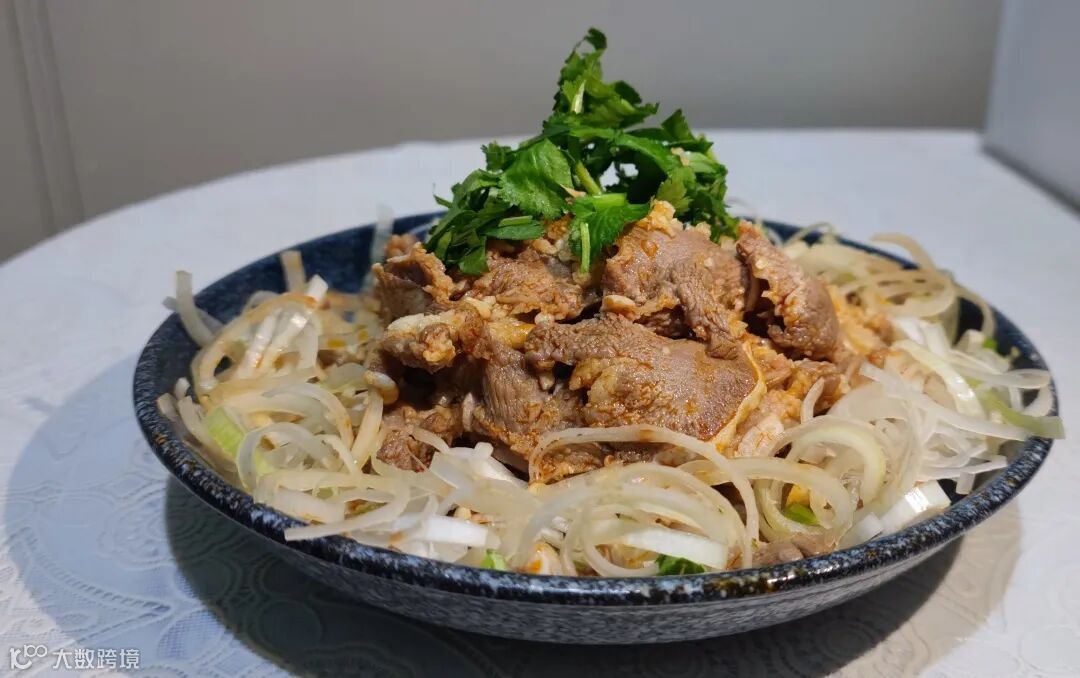 将猪舌处理干净,铺上喜欢吃的洋葱、香菜、蒜末;直接淋上酱料即可。