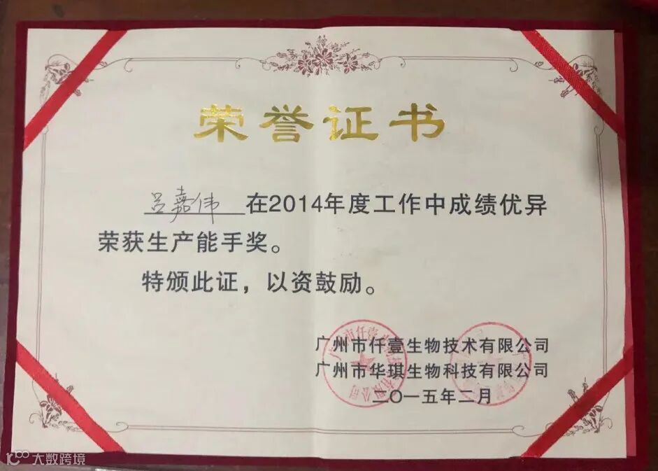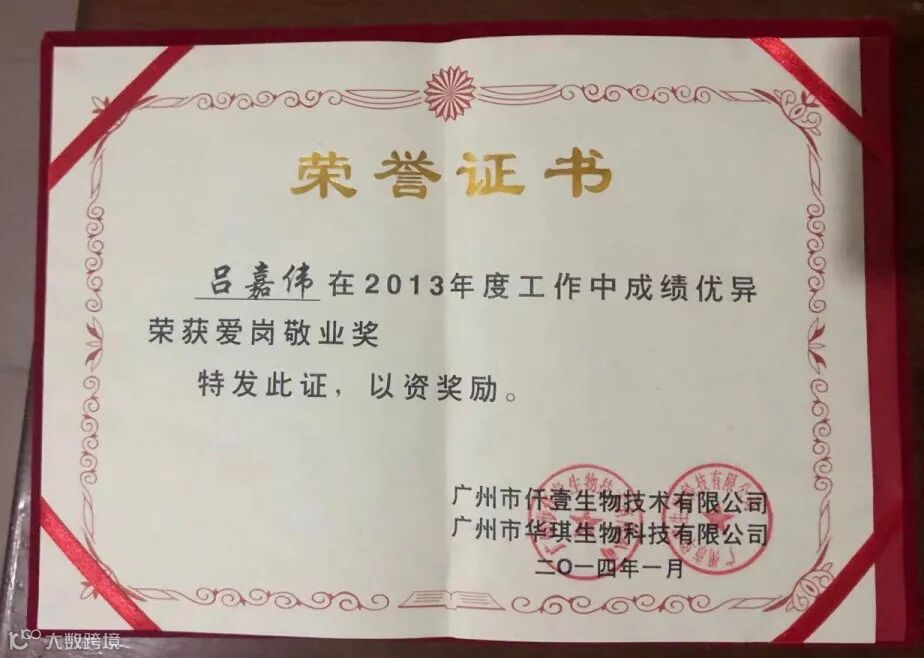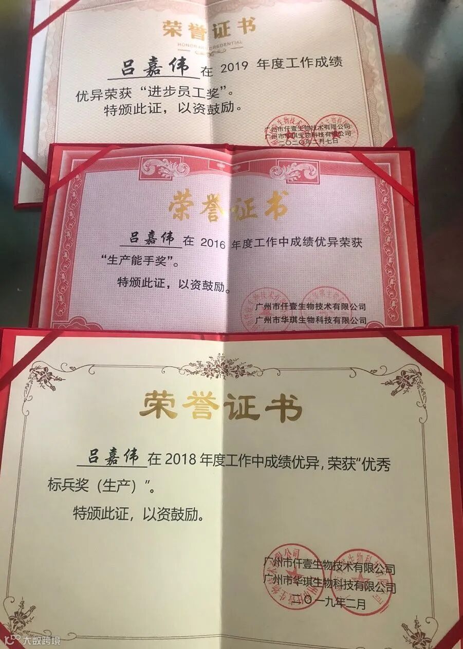 几乎每年吕嘉伟都能在年会上领奖,接受来自公司的荣誉与肯定;这其中不乏生产能手奖、优秀标兵奖、爱岗敬业奖、进步员工奖等等。
