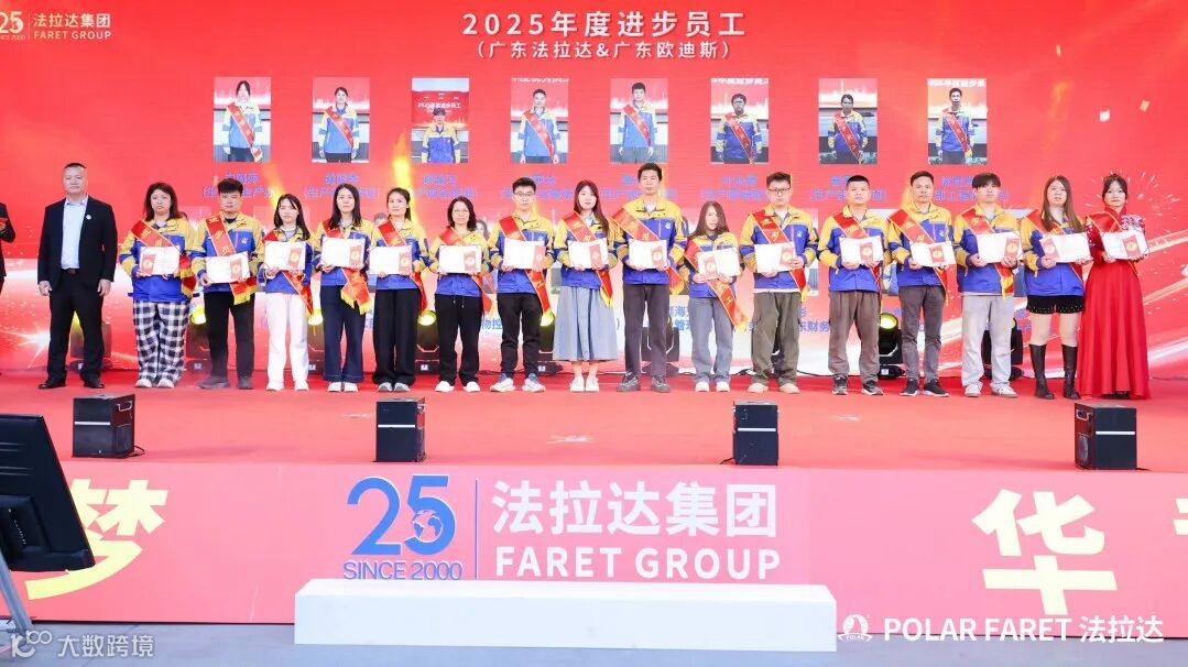 法拉达集团过去一年所斩获的每一份辉煌,都离不开全体法拉达人的辛勤付出与无私奉献。在 2025 年广东、天津两地新春晚会上,集团同步举办了隆重而温馨的年度颁奖典礼,向2025年度各个岗位上辛勤耕耘、奋勇争先、精益求精的杰出员工,致以最崇高的敬意与最诚挚的表彰。
