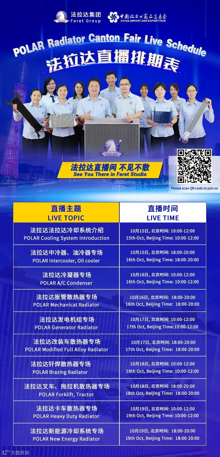 法拉达诚邀各界客户朋友莅临展会现场以及线上广交会直播间,POLAR北极熊,广交世界,互联天下!法拉达将继续为各界客户朋友提供汽车冷却系统产品,满足市场客户一站式采购需求,为全球汽车售后维修市场客户提供质优价优服务优的产品,法拉达集团诚邀各界新老客户朋友携手共进,共创双赢。