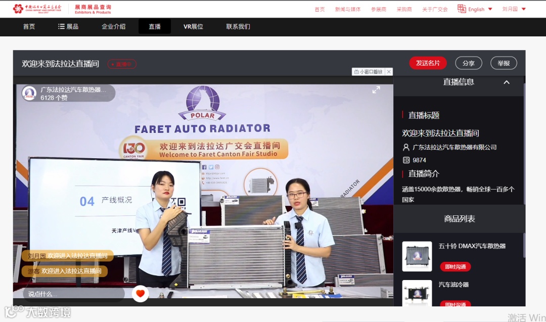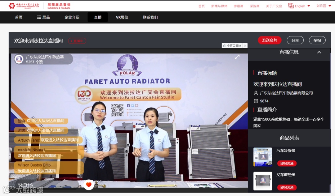 “云”上广交会,法拉达充分准备搭建线上直播间,并自主培养了专业团队,法拉达懂产品、懂贸易、懂语言的主播队再一次在线上给众多客户朋友介绍法拉达冷却系统产品,引得客户纷纷留言点赞。