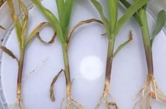 症状:苗期感病,叶片变黄,边缘枯焦,心叶卷曲易折,以后叶片由下向上逐渐干枯,无次生根,出现死苗,有少量次生根的形成弱苗,温度高时在地面近病苗处长出白霉。