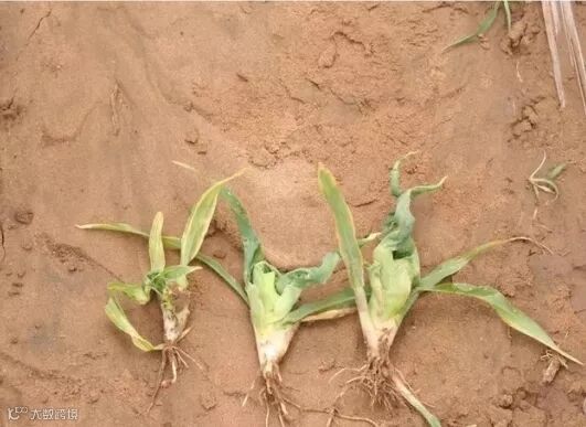 症状:主要是发生在幼苗刚出土到2叶前,玉米心叶不能抽出,幼叶皱缩扭曲不能完全展开,形成D型苗,植株矮化,受害较重时,外叶蜷缩并紧裹心叶或芽鞘紧包生长点。