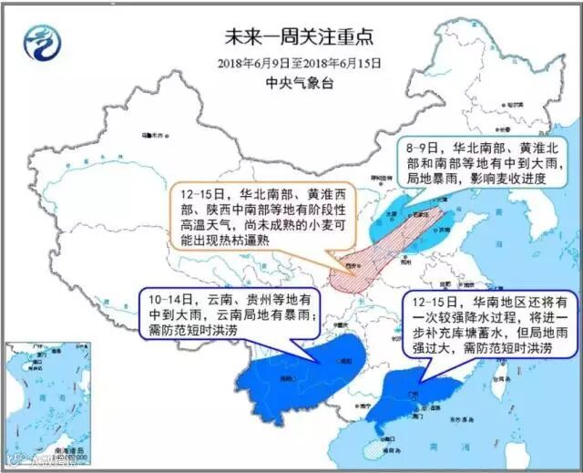 西北、华北、黄淮: 大部地区温高光足,墒情较好,利于春播作物幼苗生长、冬小麦灌浆成熟及夏玉米适时播种;河北、山东等地气温偏高2~4℃,部分麦区出现干热风天气,大部小麦已近成熟且墒情较好,总体影响不大。