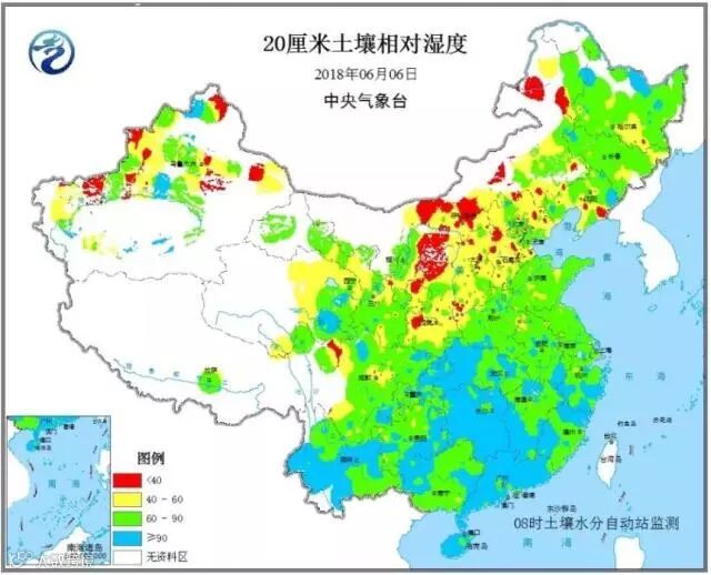 近日,全国主要农区20厘米土壤缺墒站点百分比较上周增加6.6%,较上年同期增加1.8%,缺墒地区主要集中在内蒙古中西部、陕西中部和北部、山西北部和西南部、河北中北部等地(图4);土壤过湿站点百分比较上周减少3.2%,过湿区主要位于湖北西部、湖南、江西西部、贵州东部和南部、云南中部和南部、广西西部、广东等地;墒情适宜站点百分比较上周减少3.4%,较上年同期增加2.3%。