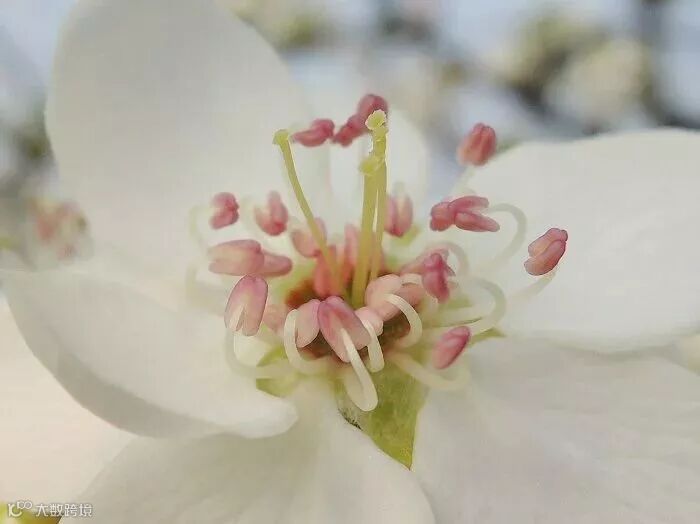 以梨花为例,一朵完整的梨花是由花柄、花托、花萼、花冠、雄蕊和雌蕊等部分组成。雄蕊是花的雄性器官,雄蕊顶端有1个囊状的花药,花药里的花粉成熟时,花药开裂释放出花粉。雌蕊是花的雌性器官,位于花的中央。雌蕊通常由基部的子房,细长的花柱和花柱顶端的柱头构成。柱头表面粗糙有黏性,用于接受花粉。