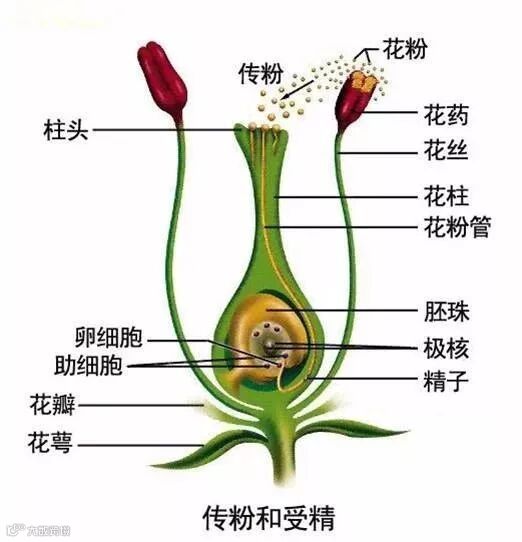 当授粉品种的花粉粒落在被授粉品种的柱头上时,约30分钟开始萌发长出花粉管,2小时后花粉管进入花柱,3天达到花柱基部,5天左右完成受精过程。子房是花的重要部分,它含有胚珠,胚珠受精以后形成合子,合子进一步发育再变成种子,子房或附属部分变成果实。