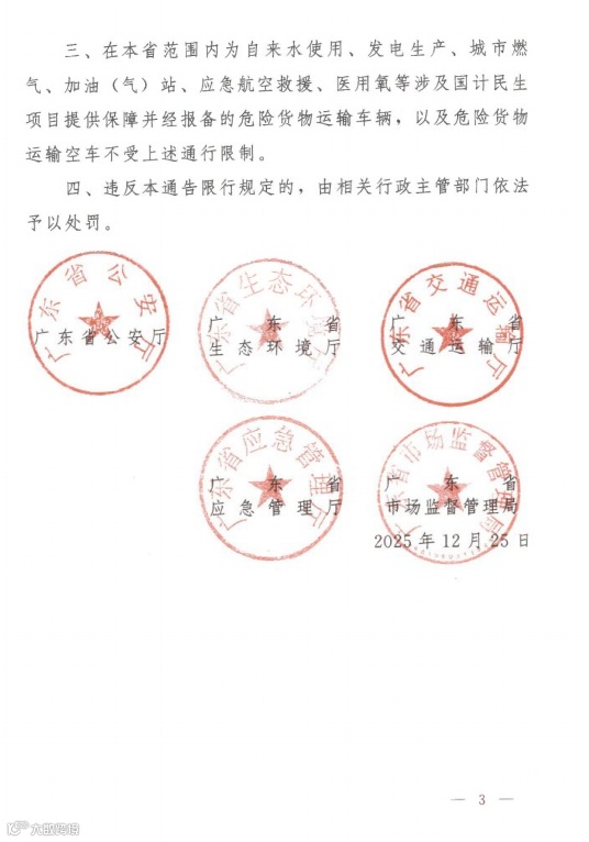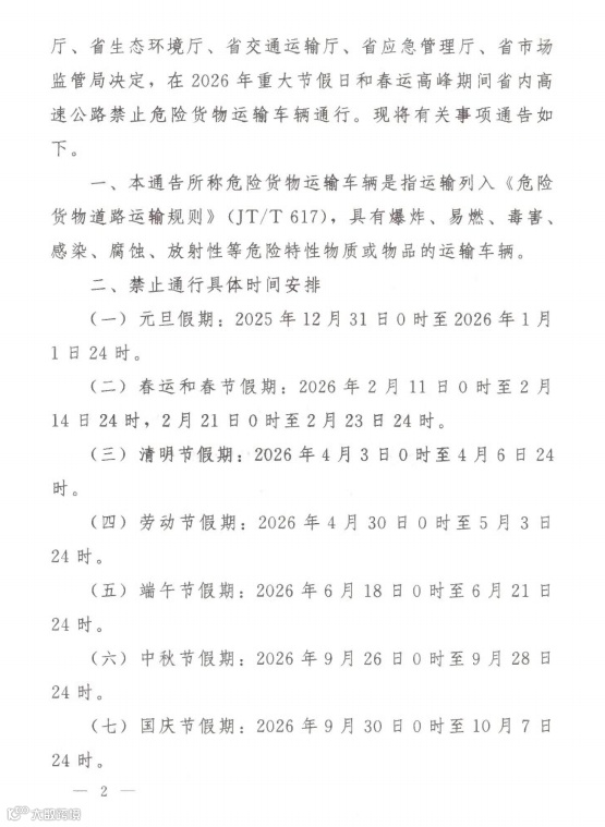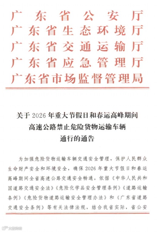 春运和春节假期:2026年2月11日0时至2月14日24时,2月21日0时至2月23日24时,广东境内高速公路禁止危险化学品运输车辆通行。