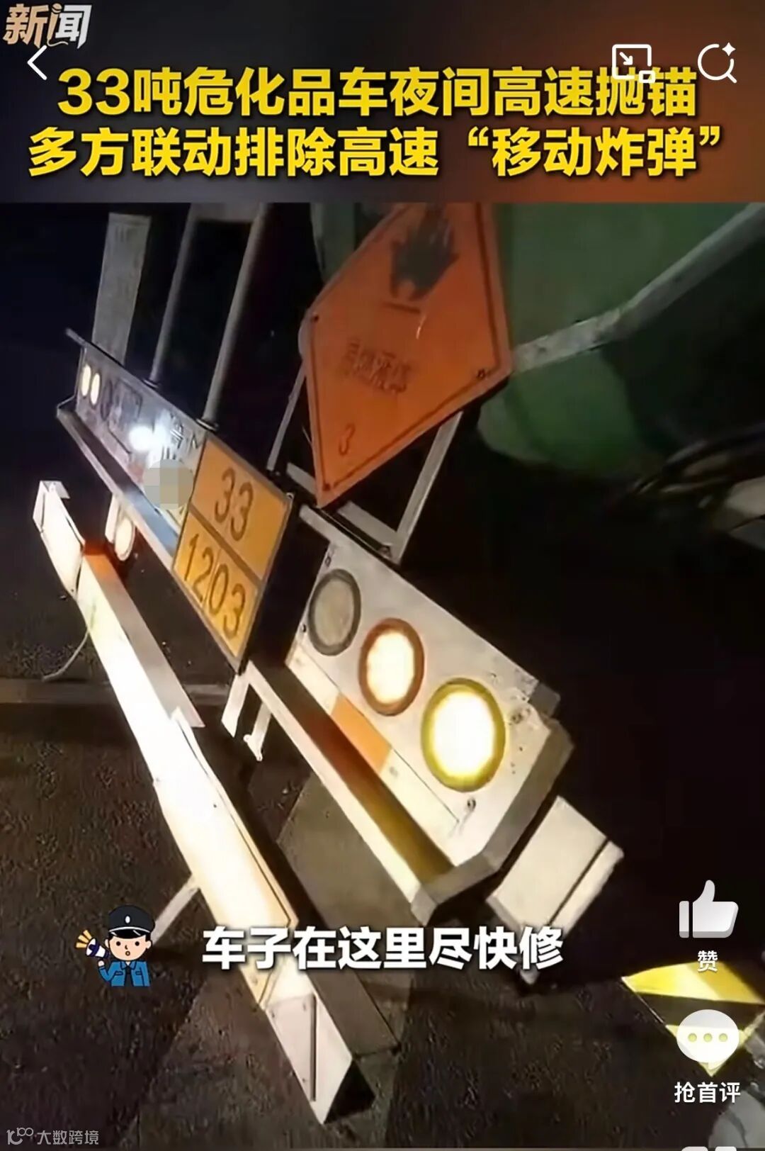 据了解,该车辆满载33吨汽油,属于易燃易爆高危危险化学品行驶途中右后车轮轴承突然损坏,无法正常行驶,只能临时停靠在应急车道,交警立即设置警戒区,联合高速公路管理处、消防等多部门合力排险。经多部门协作连夜处置,险情被成功排除,未发生泄漏及次生事故。向深夜守护者致敬!交警提醒:广大危化品运输车辆驾驶员,危化品运输车辆上高速前,一定要全方面检查到位,防止带“病”上路,行驶过程中如遇故障一定要“车靠边、人撤离、即报警”。