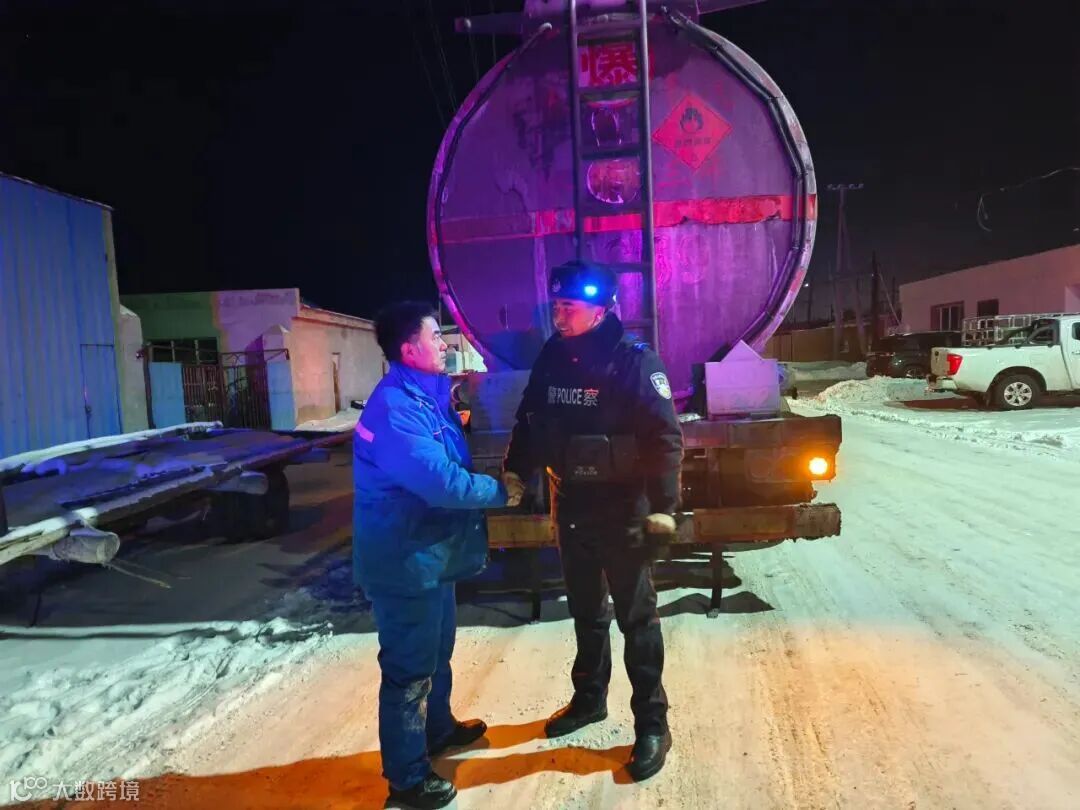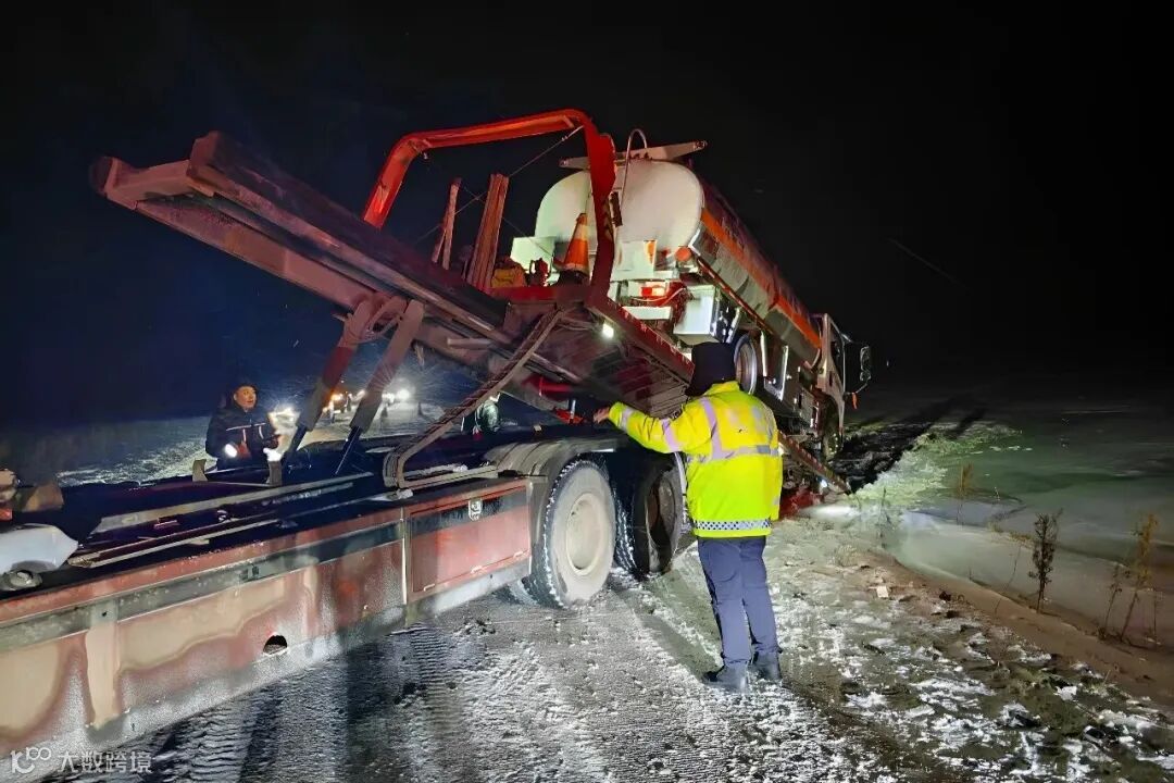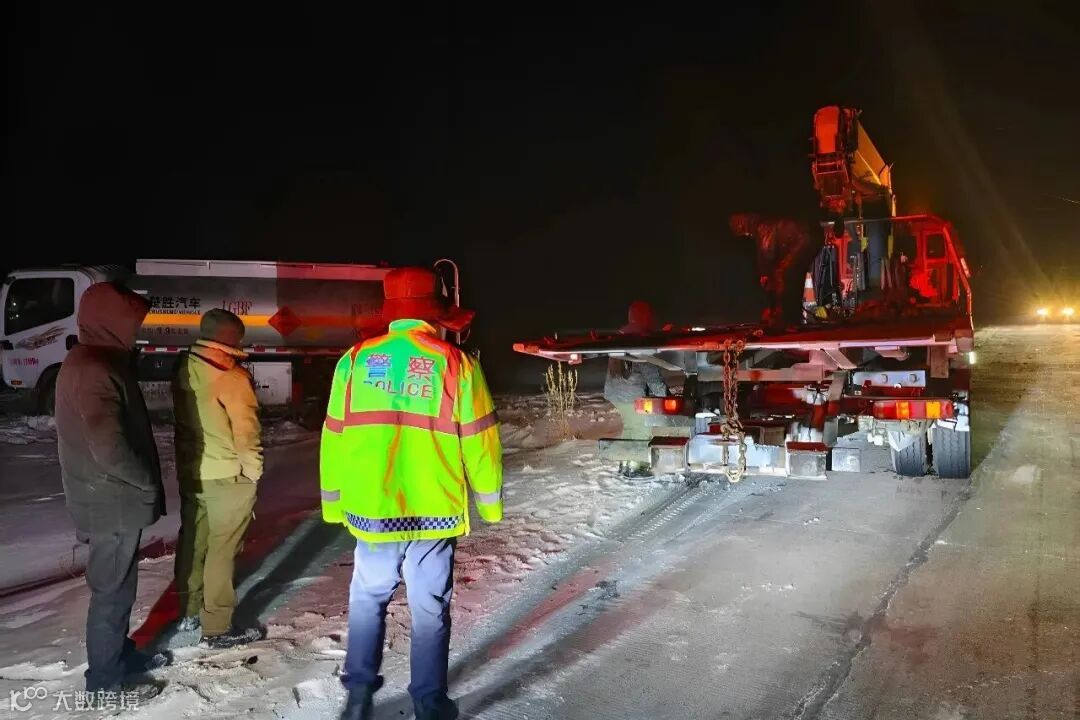 事件:12月23日晚10时许,张先生夫妇驾驶油罐车赴新疆哈巴河县南环路加油站送油,行驶至坎门尔村路口时,因路面冰雪覆盖打滑,车辆横停半坡,情况十分危急。