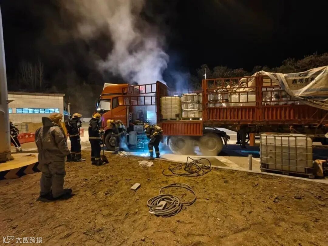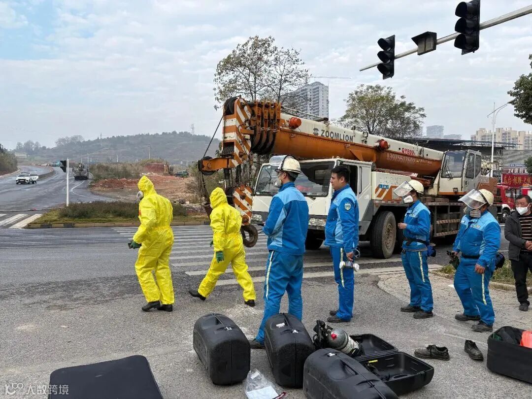 事件:12月21日21时49分,湖北沪武高速团风总路咀服务区浙江籍货车司机紧急报告:其车载氢氟酸吨桶底部阀门破损,引发泄漏。泄漏的氢氟酸浓度达40%,泄漏量约90公斤,现场情况十分危急。
