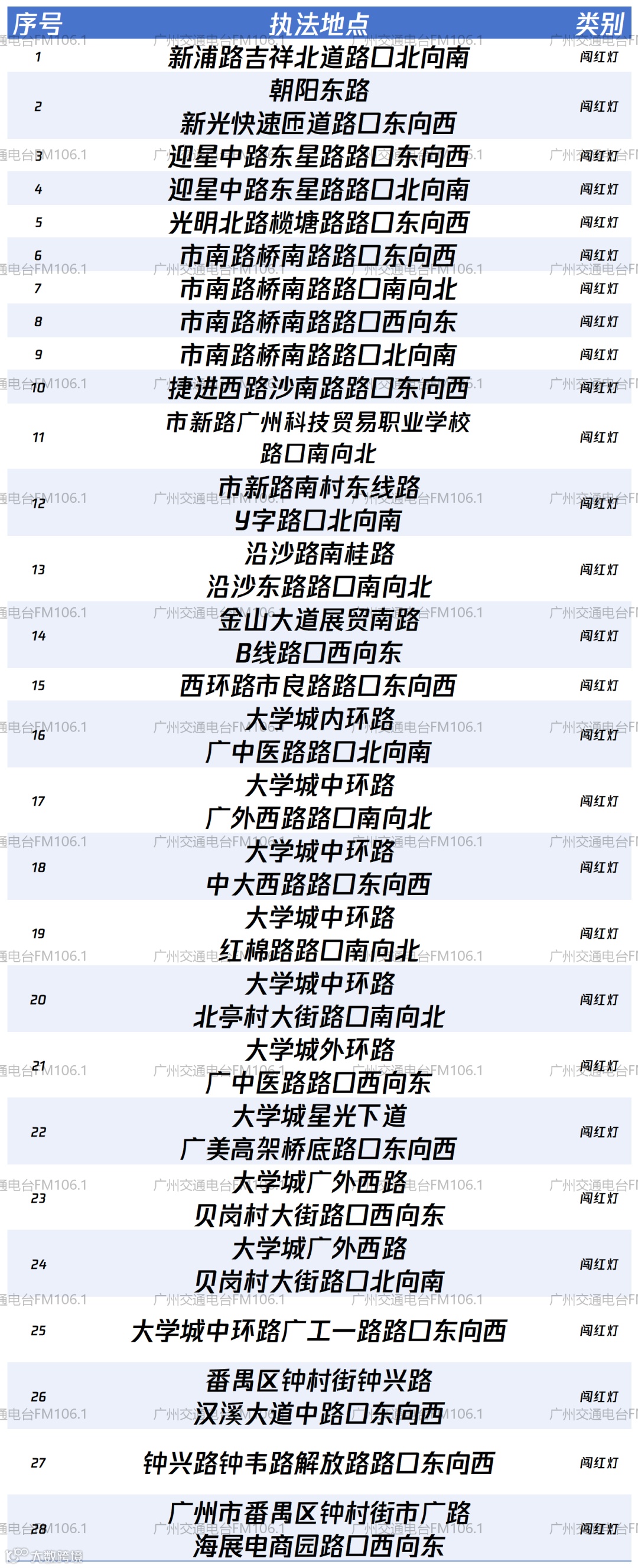 为进一步加强道路交通安全管理,规范道路交通通行秩序,保障人民群众的生命财产安全,番禺交警启用28套交通技术监控设备,根据《中华人民共和国道路交通安全法》《道路交通安全违法行为处理程序规定》(公安部第157号令)等有关法律法规规定,交警部门现向社会公布。
