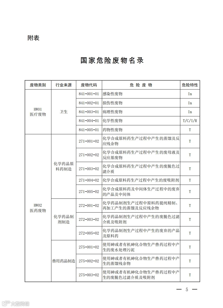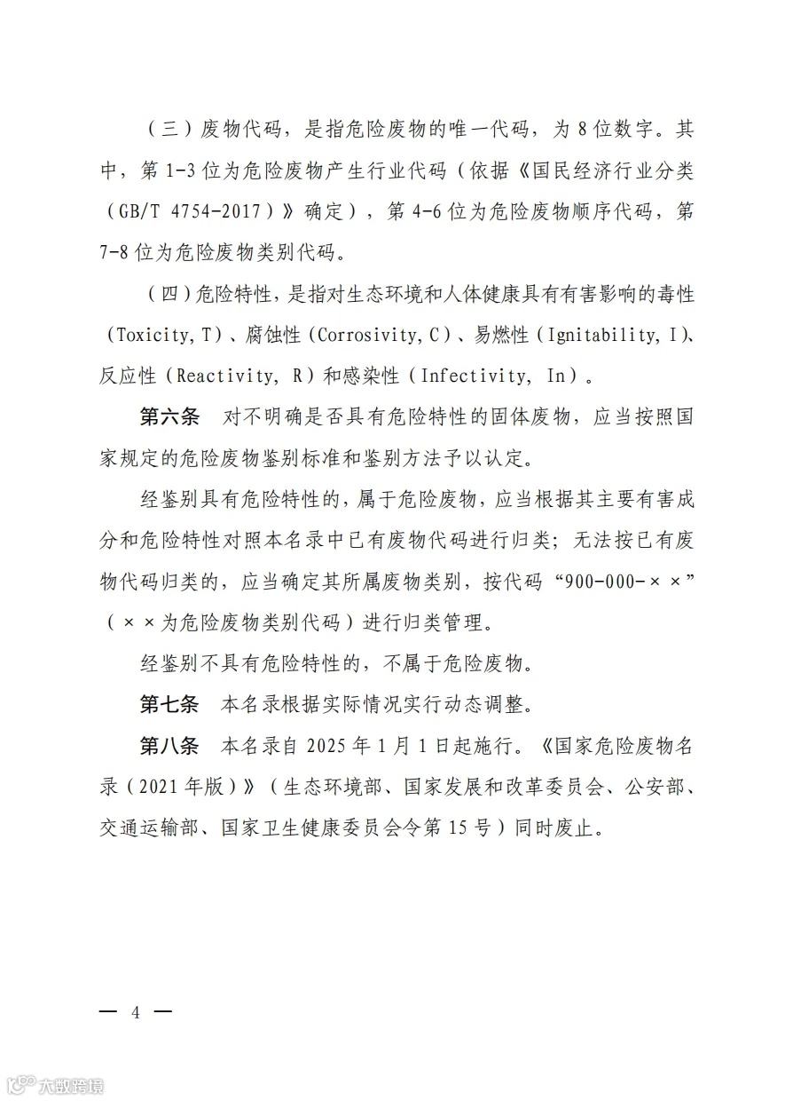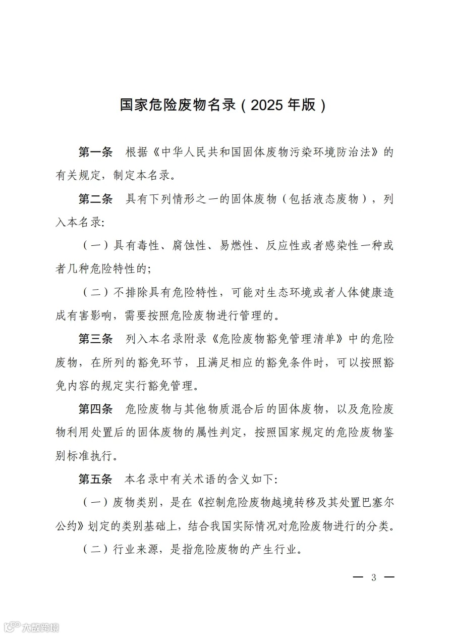 《国家危险废物名录(2025年版)》已于2024年11月8日由生态环境部2024年第5次部务会议审议通过,并经国家发展改革委、公安部、交通运输部、国家卫生健康委同意,现予公布,自2025年1月1日起施行。