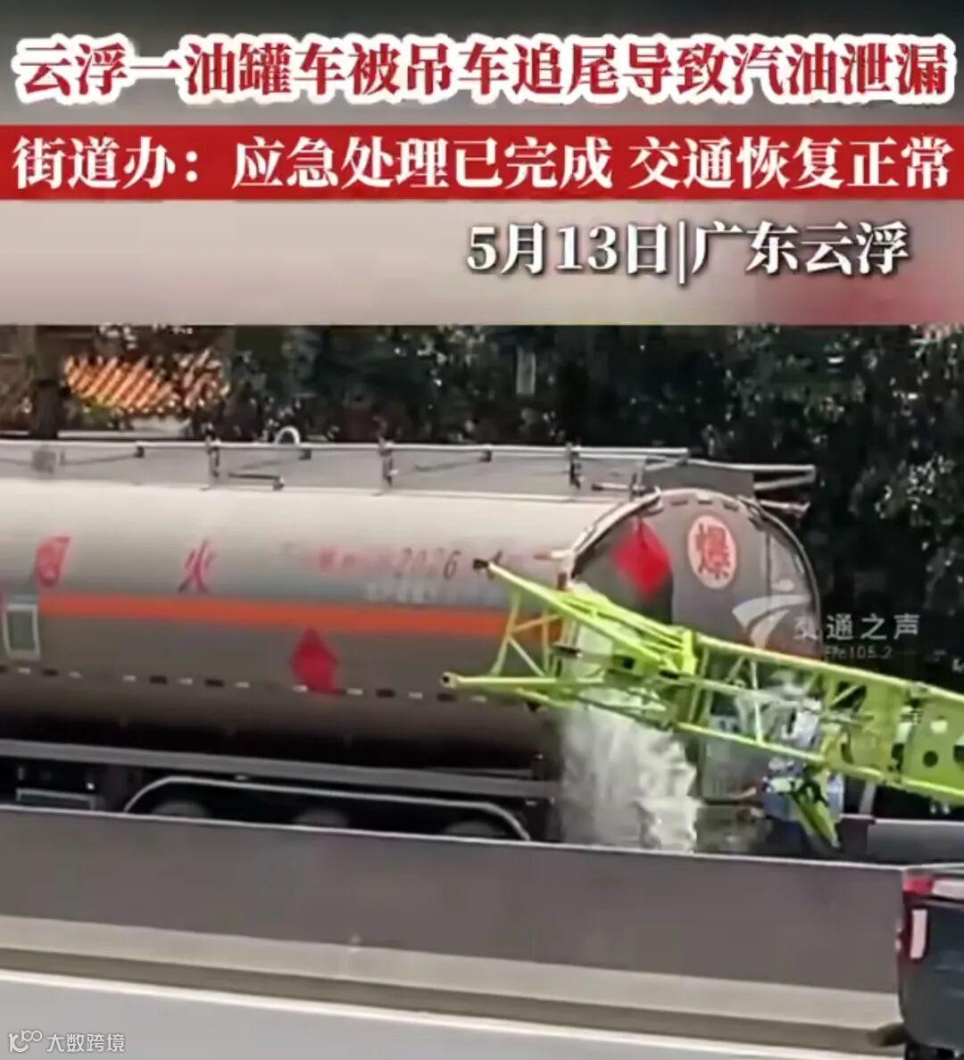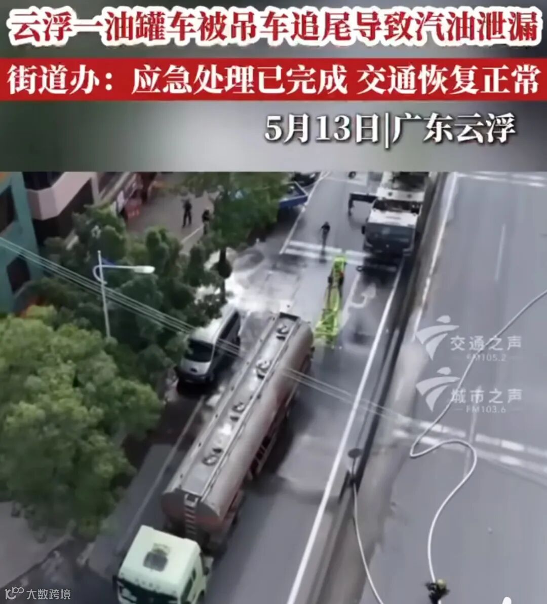 事件:5月13日12时50分许,云浮市云城区安塘街道夏洞路段附近发生一起工程吊车追尾油罐车的轻微交通事故,造成油罐车油罐破裂,车载汽油发生部分泄漏。