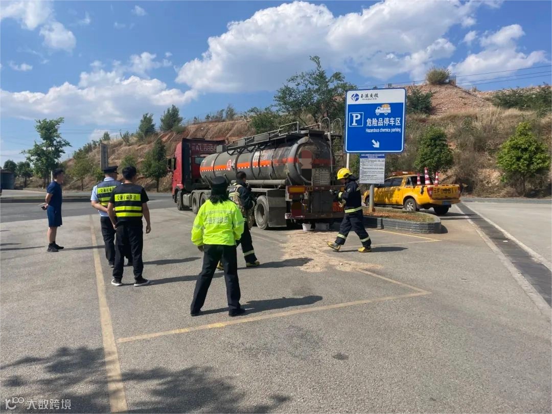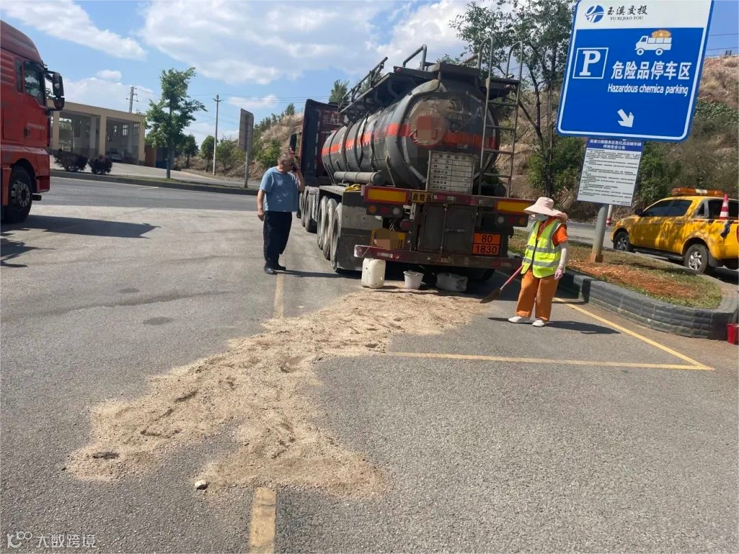 事件:5月8日下午,云南江通高速通海服务区疏导员在例行巡查中发现,一辆装载硫酸的危险品运输车在危化品停车位上发生泄漏,情况十分危急。