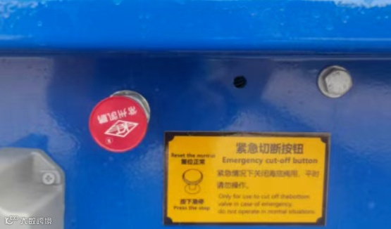 罐体紧急切断阀控制按钮应安装在车尾易于操作的位置,完好有效,在非装卸作业时处于闭合状态。按钮若安装保护罩应无破损,且按钮旁有紧急切断明显文字标识。