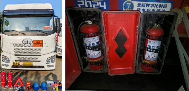 1.车辆须配备2个4KG以上干粉灭火器, 驾驶室内应配备1个不小于1KG的灭火器,且完好有效,便于取用。