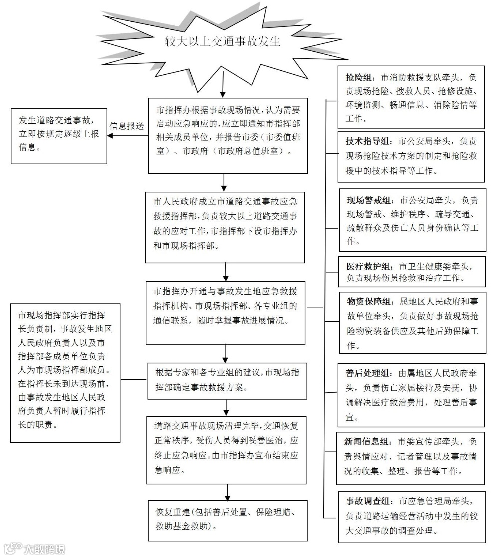 市人民政府成立市道路交通事故应急救援指挥部(以下简称市指挥部),负责较大以上道路交通事故的应对工作。
