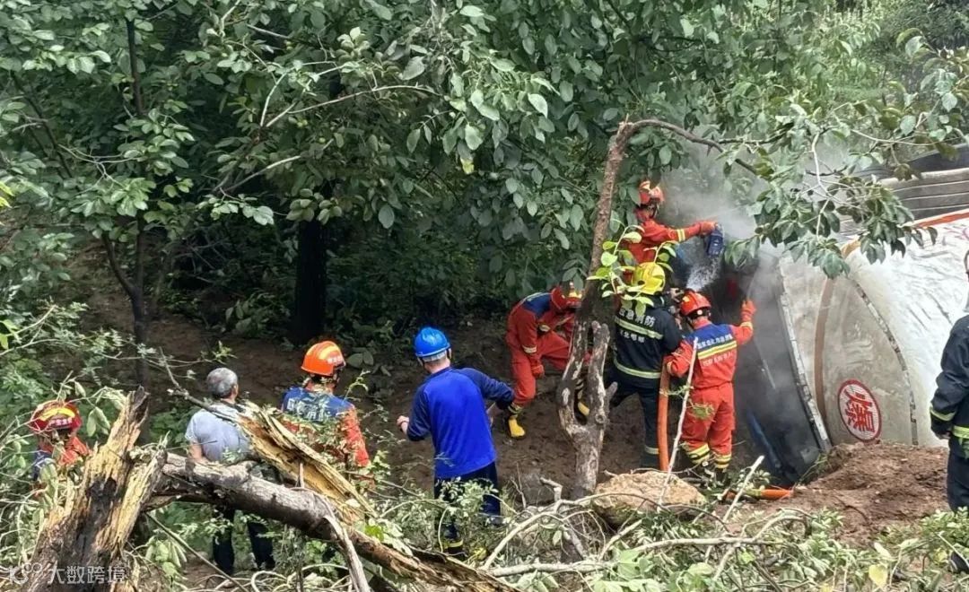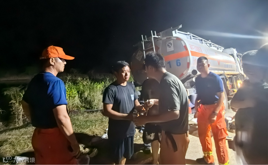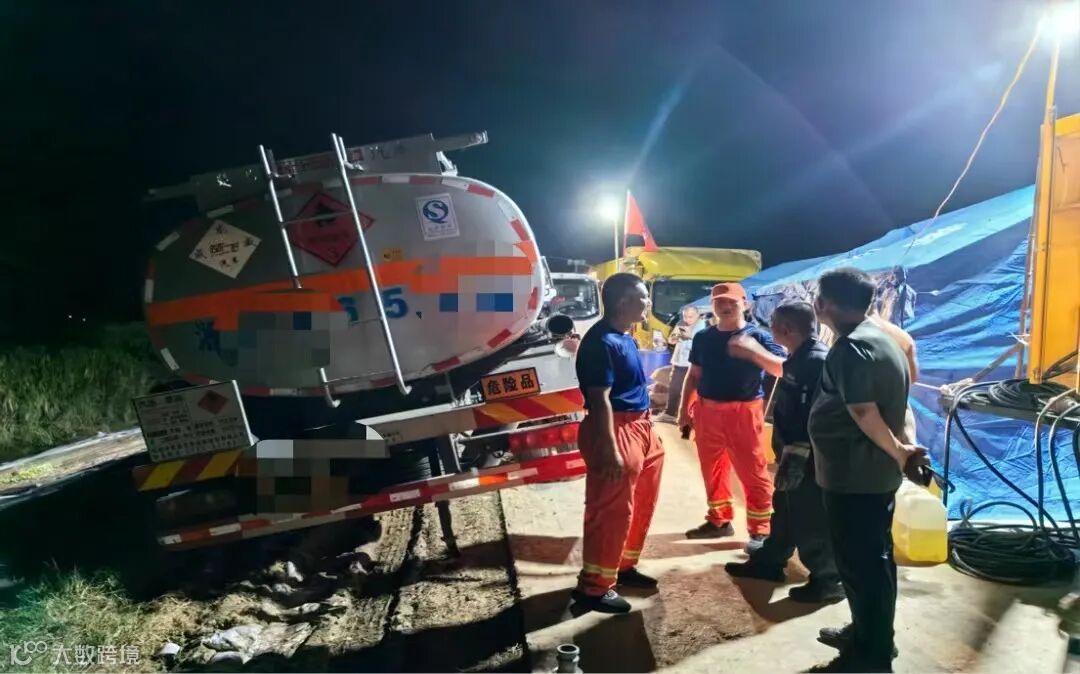 事件:7月14日,广东的救援队伍在湖南岳阳排涝时,发现一油罐车轮胎陷在堤坝上,车身向洞庭湖一侧倾斜,有侧翻风险。