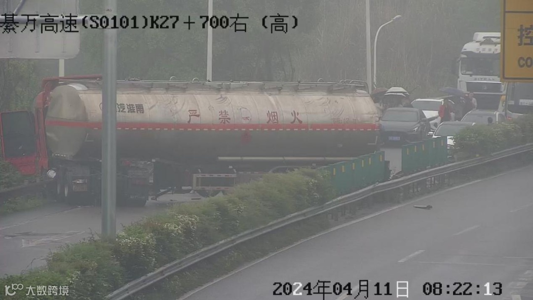 4月11日8时9分许,重庆交通执法总队高速公路第三支队六大队执法人员在数字执法室开展网络巡查时发现,一危化品运输车在綦万高速公路万盛往綦江方向南桐镇境内行驶途中突然撞向护栏,事故造成车身呈“V字形”将綦江方向交通完全中断。