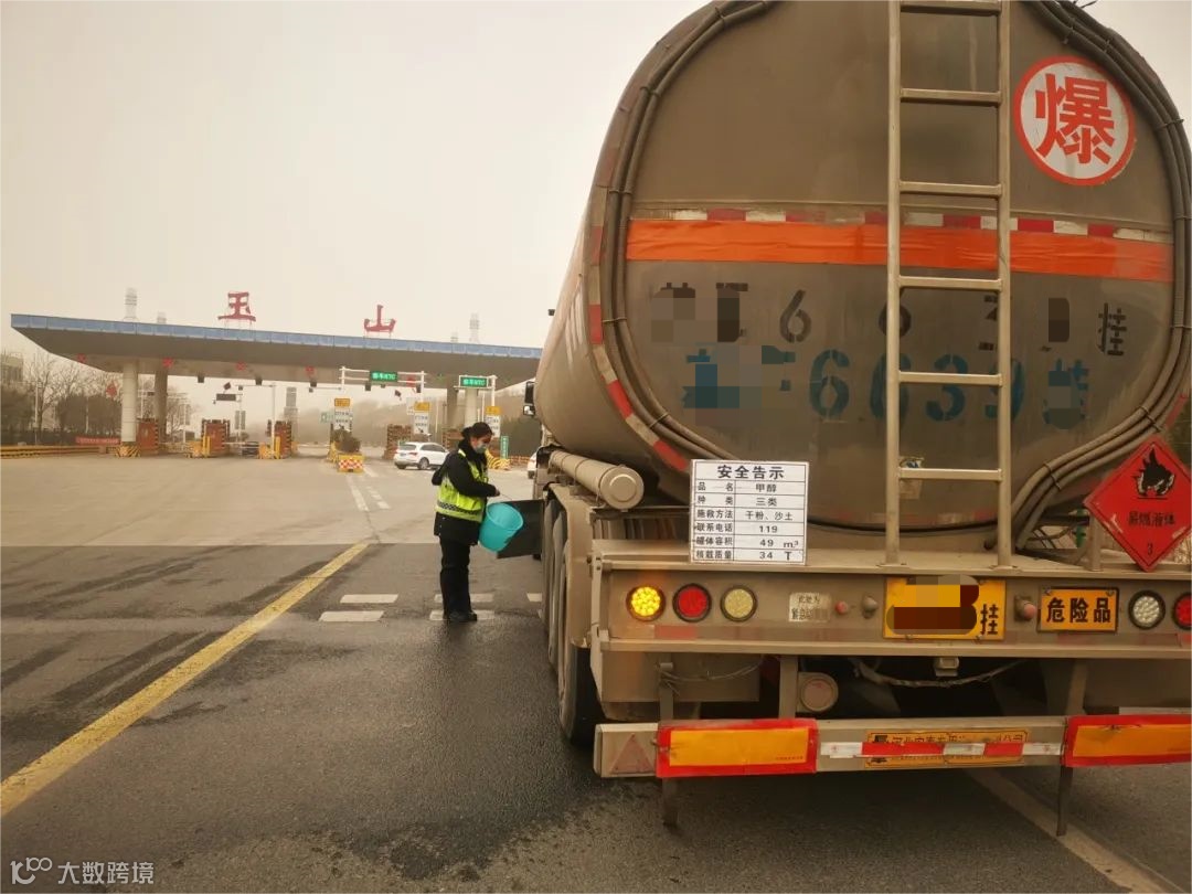 事件:2月18日13时许,陕西蓝田东管理所玉山收费站一辆车号为苏E的六轴满载甲醇危化品车辆,驶入入口车道,当班人员在发卡时发现该车左后轮胎冒黑烟。