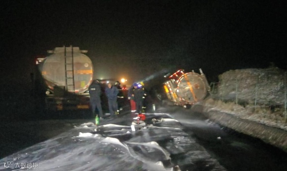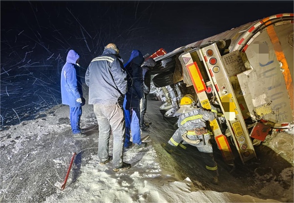 内蒙古一危化品车雪天路滑致侧翻