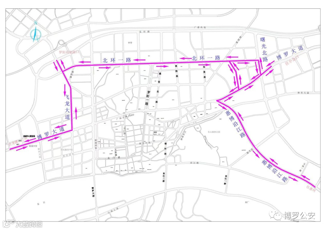 路线一:惠博沿江路→G324线→经二路(曙光北路)→北环一路→飞龙大道→G324线(往龙溪、广州方向)