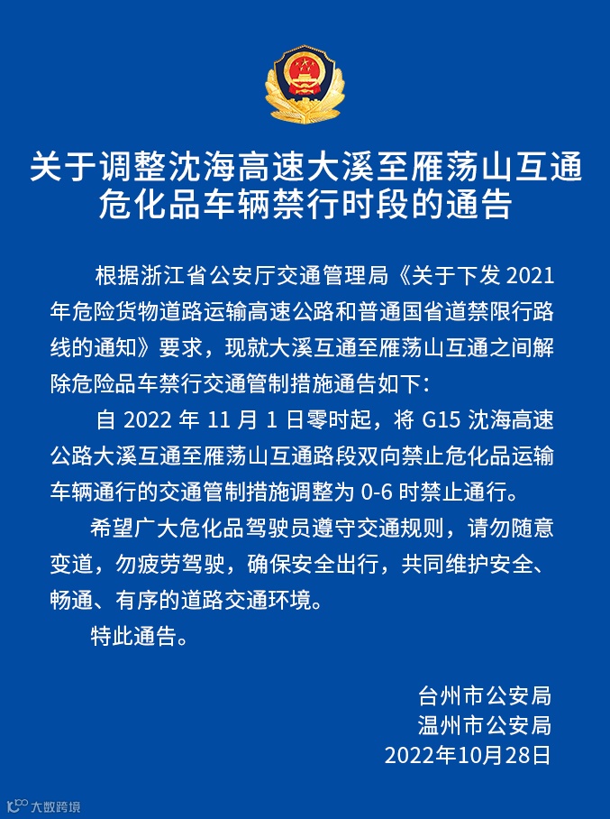自2022年11月1日零时起,将G15沈海高速公路大溪互通至雁荡山互通路段双向禁止危化品运输车辆通行的交通管制措施调整为0-6时禁止通行。