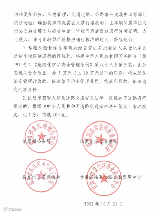 此通告发布后,对强行通行、不听劝阻的危化品运输车辆,由临夏州公安、应急管理、交通运输、公路事业发展中心等部门依法处理;确因特殊情况需驶入禁行路段的,由车辆所属单位向州公安局交警支队提交申请,审批同意后发放通行许可证明,方可驶入,许可车辆须严格按照通行核准的时间、路线通行。
