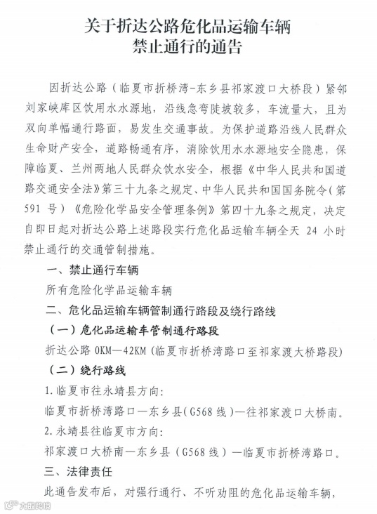 因折达公路(临夏市折桥湾-东乡县祁家渡口大桥段)紧邻刘家峡库区饮用水水源地,沿线急弯陡坡较多,车流量大,且为双向单幅通行路面,易发生交通事故。为保护道路沿线人民群众生命财产安全,道路畅通有序,消除饮用水水源地安全隐患,保障临夏、兰州两地人民群众饮水安全,根据《中华人民共和国道路交通安全法》第三十九条之规定、中华人民共和国国务院令(第591号)《危险化学品安全管理条例》第四十九条之规定,决定自即日起对折达公路上述路段实行危化品运输车辆全天24小时禁止通行的交通管制措施。
