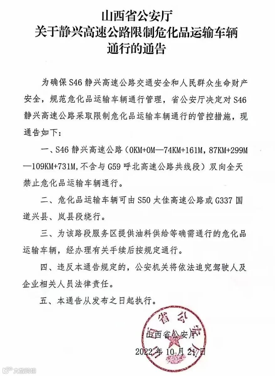 山西省公安厅关于静兴高速公路限制危化品运输车辆通行的通告