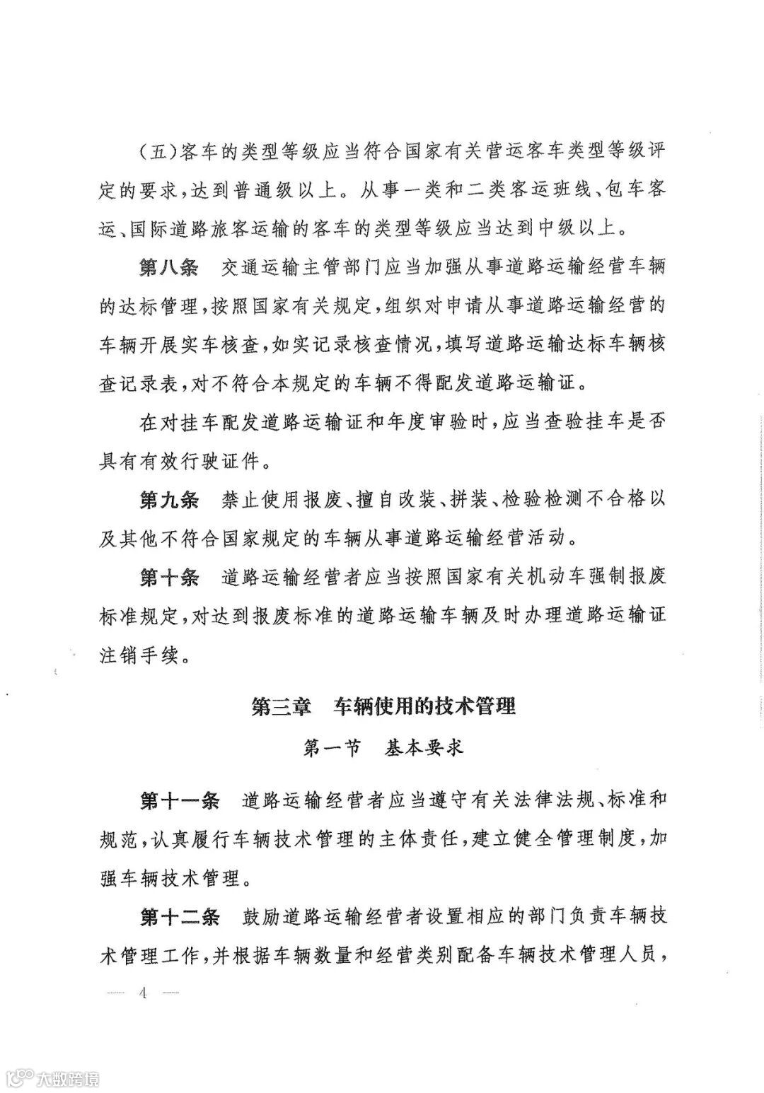第四条 道路运输经营者是道路运输车辆技术管理的责任主体,负责对道路运输车辆实行择优选配、正确使用、周期维护、视情修理、定期检验检测和适时更新,保证投入道路运输经营的车辆符合技术要求。