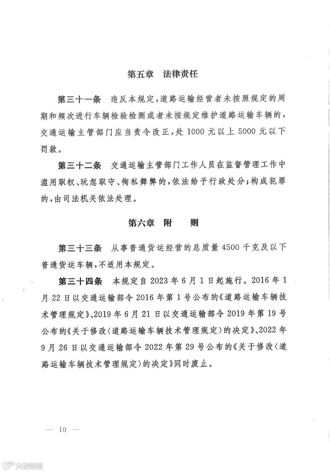 第三十四条 本规定自2023年6月1日起施行。2016 年1月22日以交通运输部令 2016 年第 1号公布的《道路运输车辆技术管理规定》、2019年6月21日以交通运输部令2019年第19 号公布的《关于修改<道路运输车辆技术管理规定>的决定》、2022 年9月26日以交通运输部令 2022 年第 29 号公布的《关于修改道路运输车辆技术管理规定>的决定》同时废止。