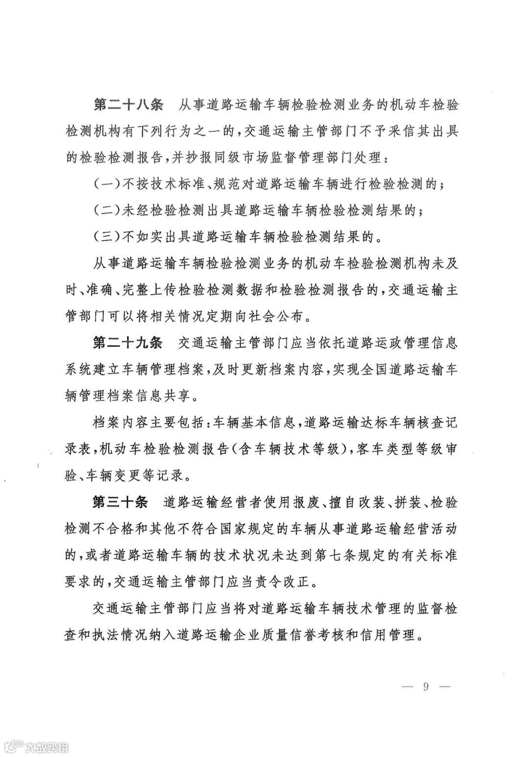 第九条 禁止使用报废、擅自改装、拼装、检验检测不合格以及其他不符合国家规定的车辆从事道路运输经营活动。