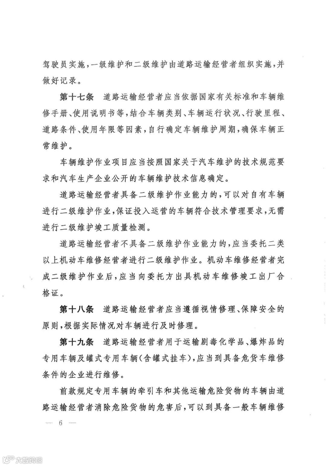 第十七条 道路运输经营者应当依据国家有关标准和车辆维修手册、使用说明书等,结合车辆类别、车辆运行状况、行驶里程道路条件、使用年限等因素,自行确定车辆维护周期,确保车辆正常维护。