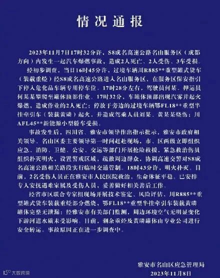 事件:11月7日17时37分左右,四川成都至名山高速公路雅安境名山服务区(成都方向)内,一辆油罐车起火燃烧,并引燃一辆黄磷罐车轮胎。