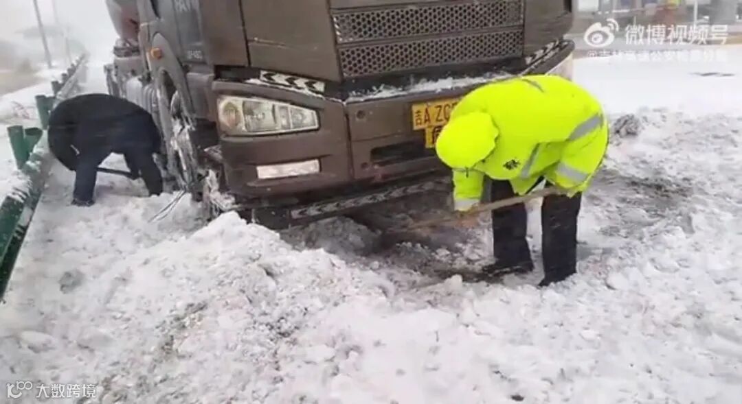 事件:11月7日8时30分许,在暴雪停息后的第一个早晨,内蒙古高速交警二支队通辽大队接到求助电话,有一辆大型货车和一辆危化品运输车辆被困在匝道内,请求救援。