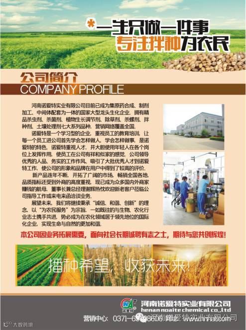 河南诺爱特实业有限公司,是一家致力于精细化产品研发、生产、营销、代理为一体的高新技术企业。秉承“诚信为根本,双赢为中心、客户为上帝”,勇于打造国内知名环保型农药品牌,竭诚希望与您携手共进,共创辉煌。