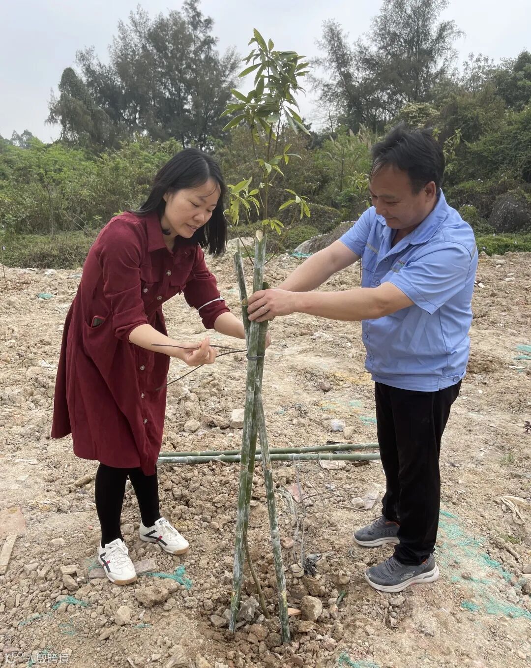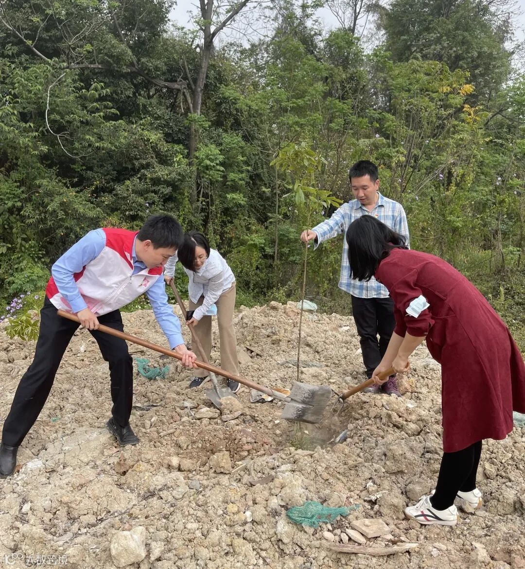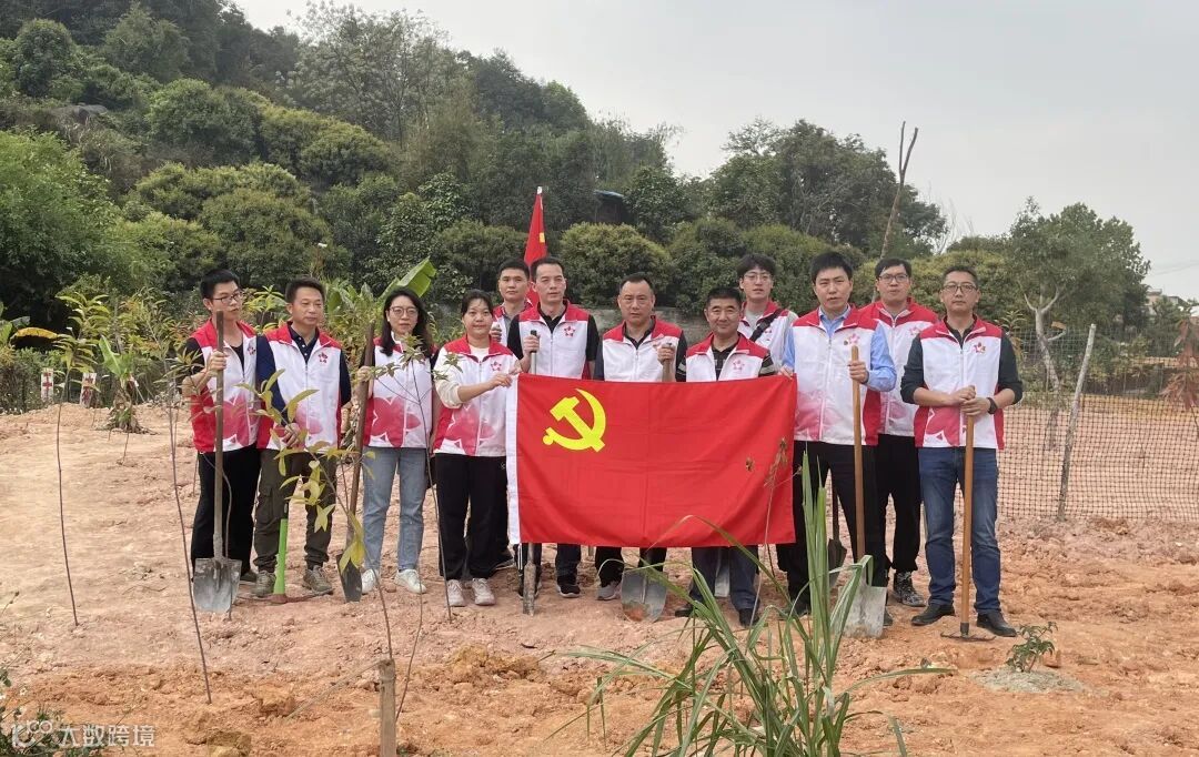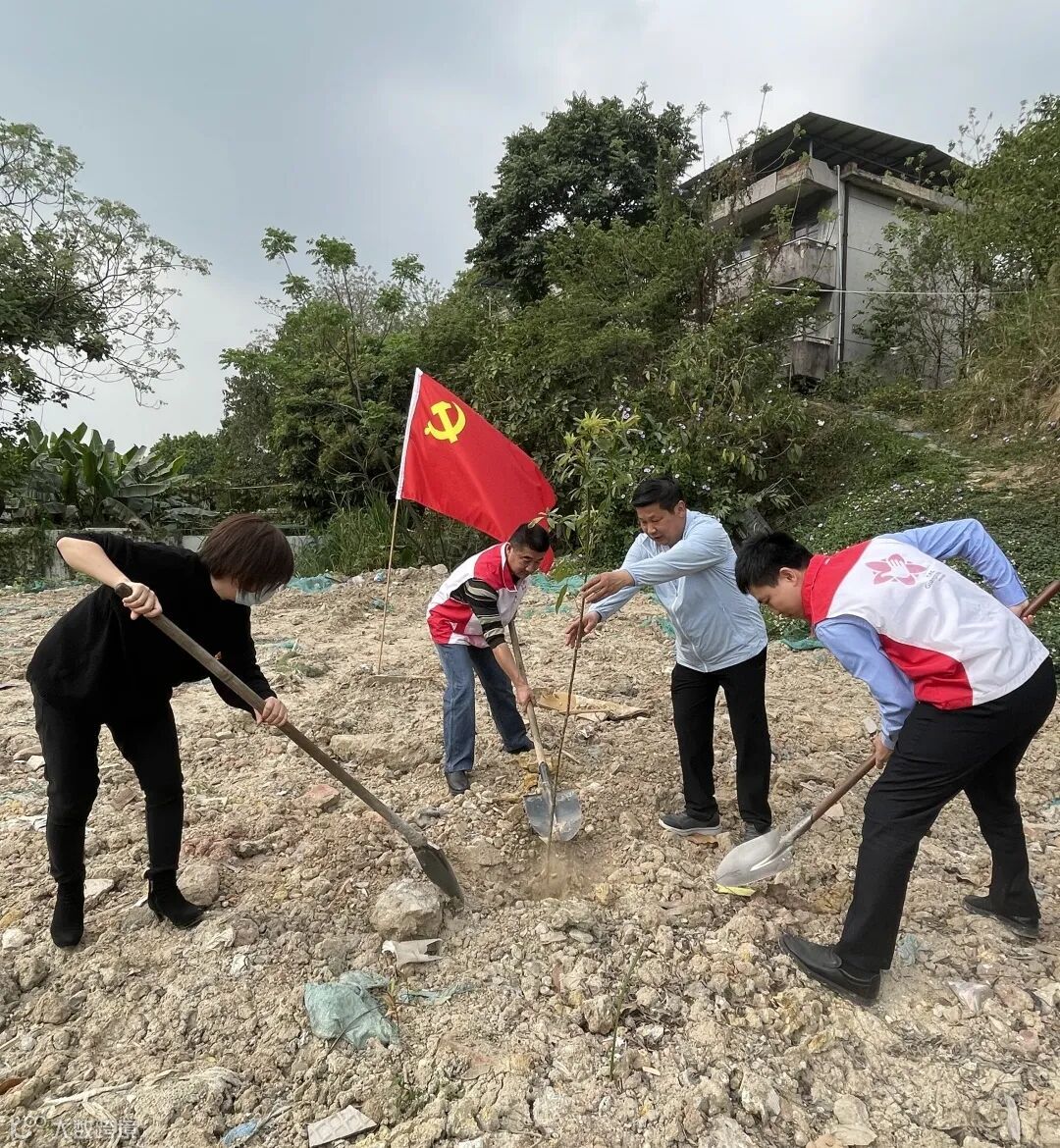 在植树现场,党员和入党积极分子发扬不怕苦不怕累的精神,清理砖头、挖土、扶植树苗、填土、浇水灌溉,各个环节配合默契,充分展现团结、互助、友爱的精神。新植的树苗昂然挺立,在和煦的微风中萌发盎然生机,与鲜艳的党旗、绽放的笑容形成一道亮丽的风景。