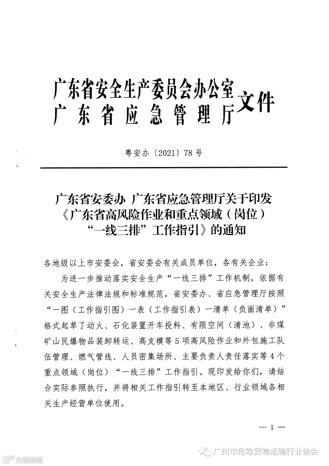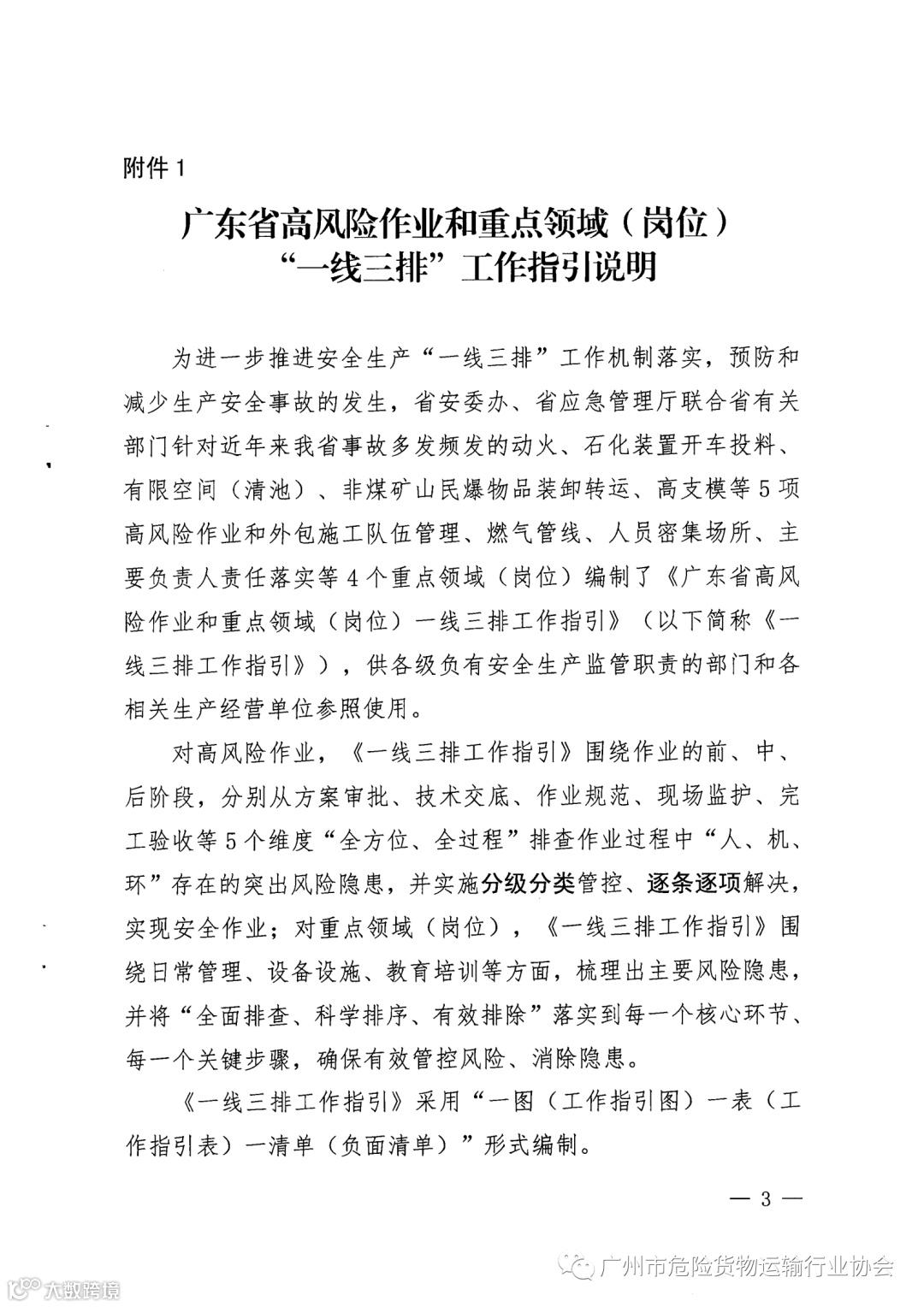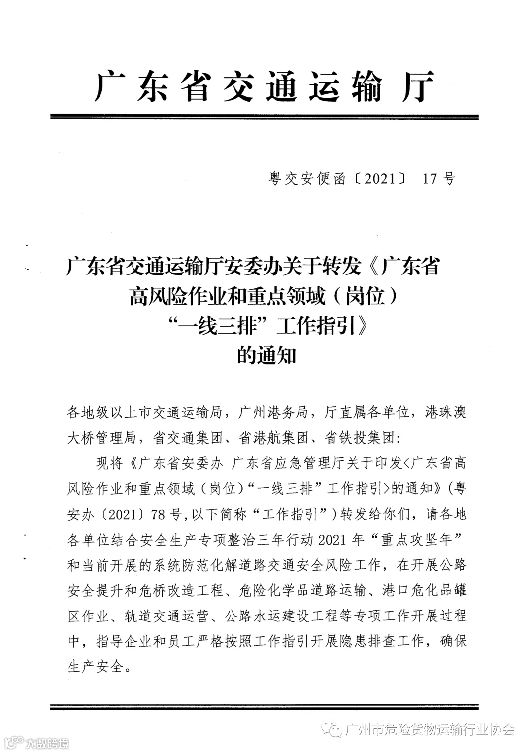 导读:广东省交通运输厅安委办关于转发《广东省高风险作业和重点领域(岗位)“一线三排”工作指引》的通知