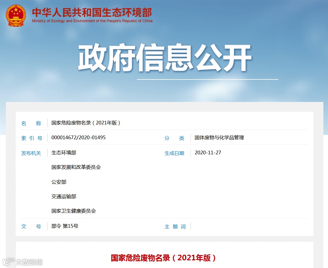 《国家危险废物名录(2021年版)》已于2020年11月5日经生态环境部部务会议审议通过,现予公布,自2021年1月1日起施行。