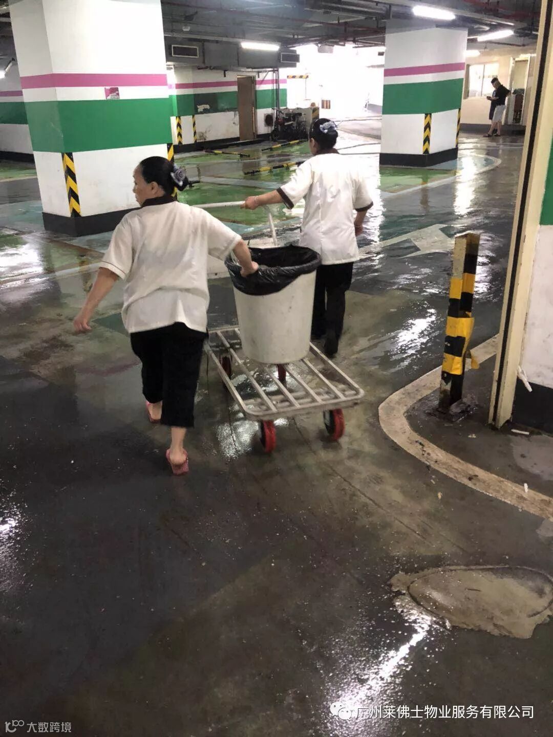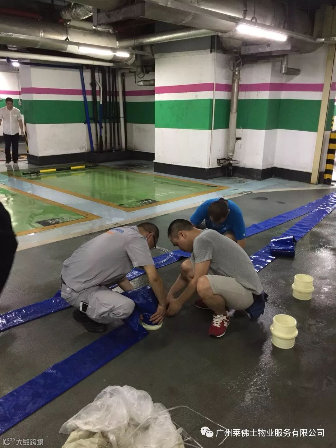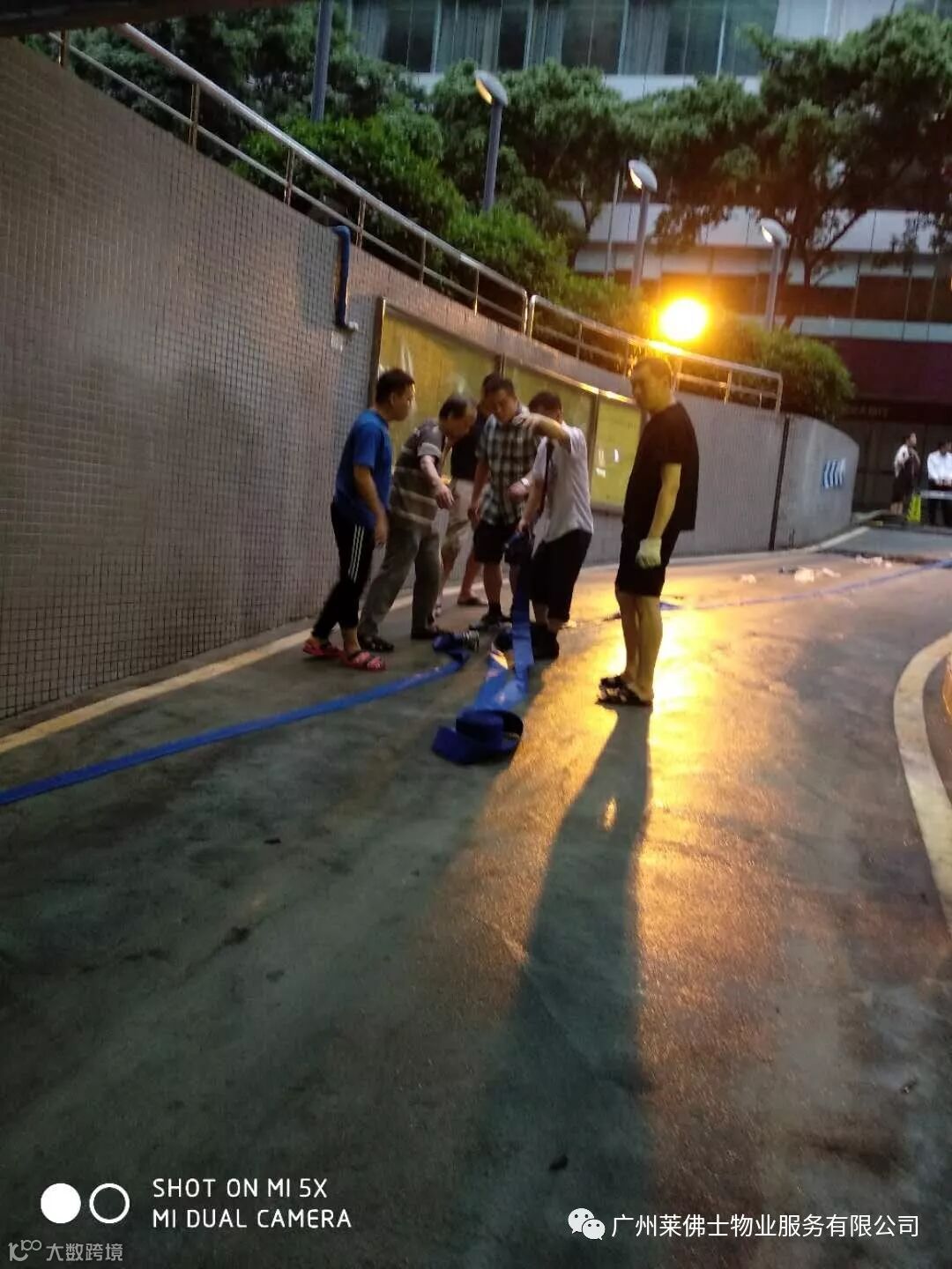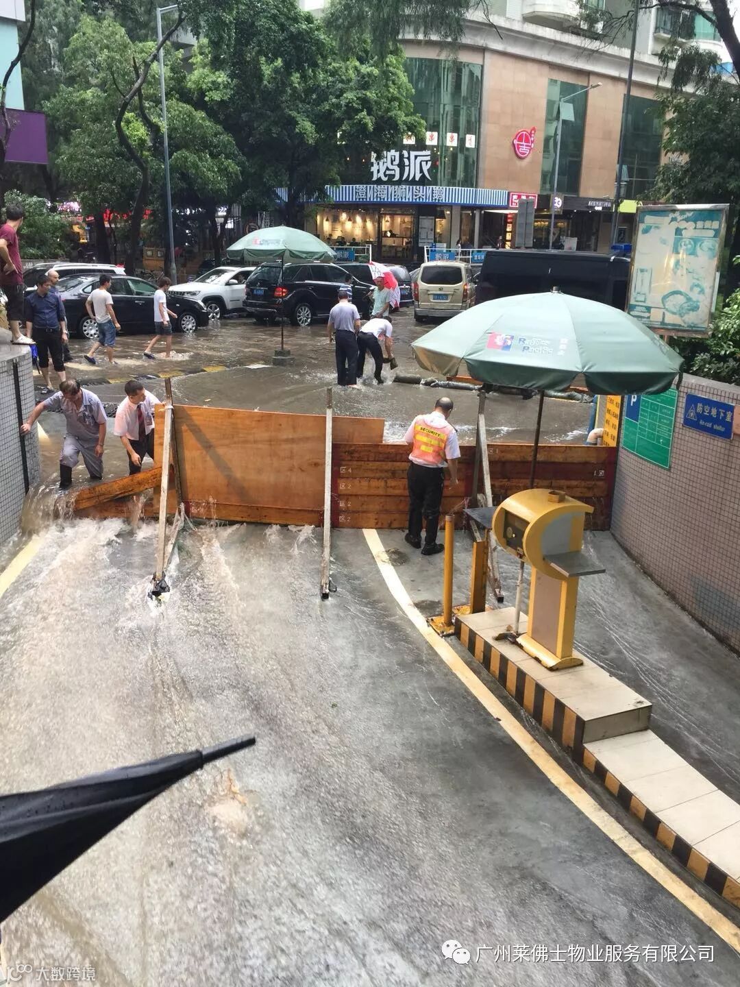物业车库入口出现外水倒灌,管理处抢险人员紧急行动,扛沙袋封堵地下车库进出口处,与洪水赛跑,守卫停车场。