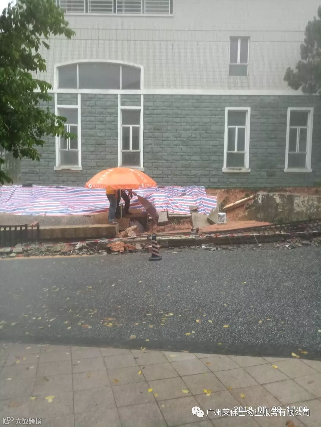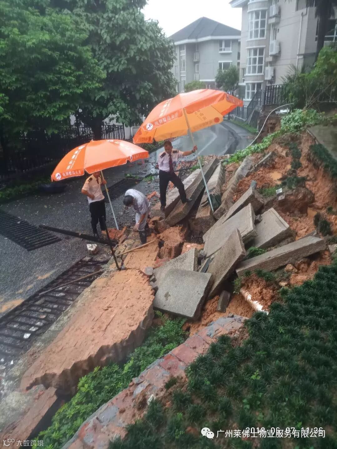小区挡土墙被洪水冲毁,物业工作人员冒雨进行检查、防护及清理工作,以防止灾情进一步发展,并通知附近业户注意安全,尽量留守安全地方。