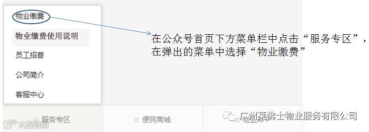 1、打开本公众号,在页面的最下方找到菜单栏,依次选择“服务专区”--“物业缴费”选项,如下图所示