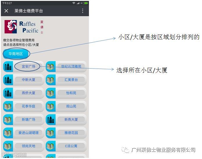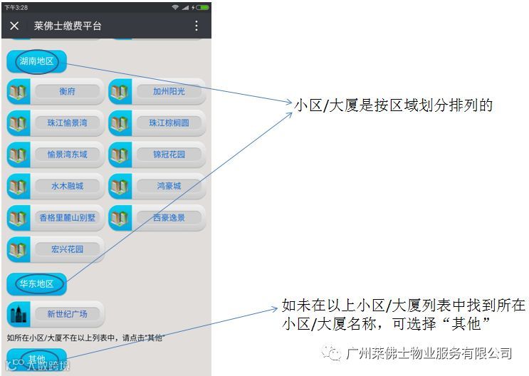 2、在打开的页面里找到所要缴费的小区/大厦的名称,并点击选择。如下图所示