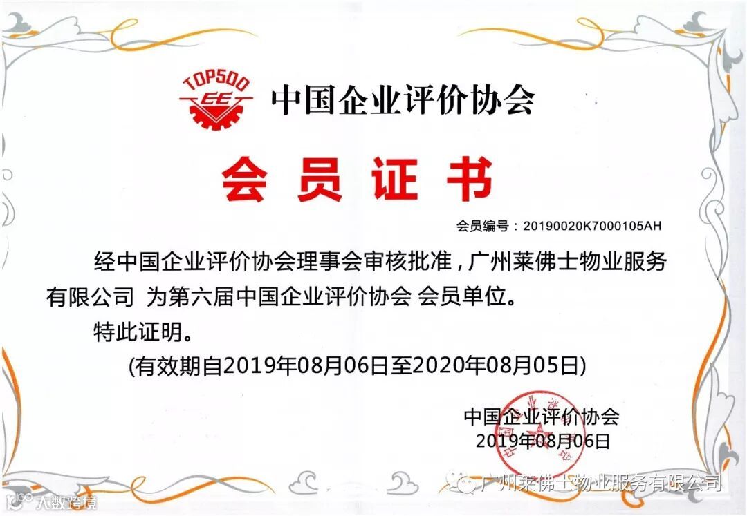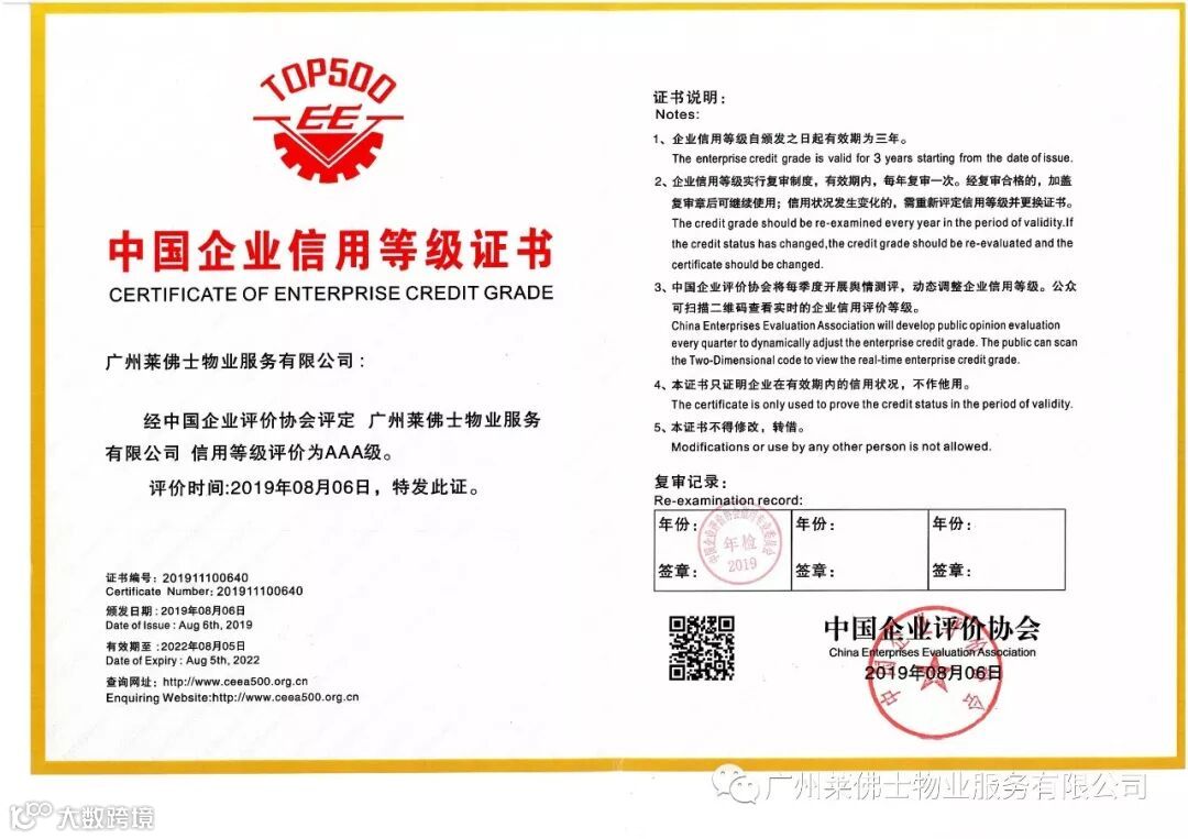此外,捷报再传,「中国企业评价协会」(国务院发展研究中心于1991年发起成立,是民政部注册、唯一具备企业评价资质的国家级社团法人组织)根据莱佛士物业优秀的企业管理能力、经济偿付能力和营运能力、基础信用能力、社会信用记录等方面,将莱佛士物业评定为3A中国企业信用等级,并授予AAA最高的等级证书和中国企业评价协会会员证书。