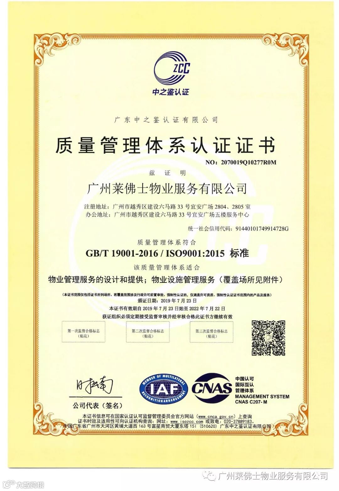 莱佛士物业作为一家以物业服务为根基,以服务平台为介质,以智慧科技为手段的大型综合服务企业,也将继续通过规范化管理和专业化创新,坚守“专业、专注”的核心价值理念,服务好所有客户和伙伴,为建设卓越服务企业寻求更广阔的发展空间。此次证书的获得只是第一步,让质量、环境及职业健康安全的意识在每个员工心中生根发芽,对高品质、高客户满意度的执着坚持和持续兑现才是认证的核心目的,公司也将持续不断的深入推行员工培训,充分培养和引导员工形成规范、标准化操作的服务意识,不断增长专业知识,提升服务技能,打造出一支卓越服务,持续创新的管理及服务团队,为客户提供更多高效、优质、专业的物业服务。