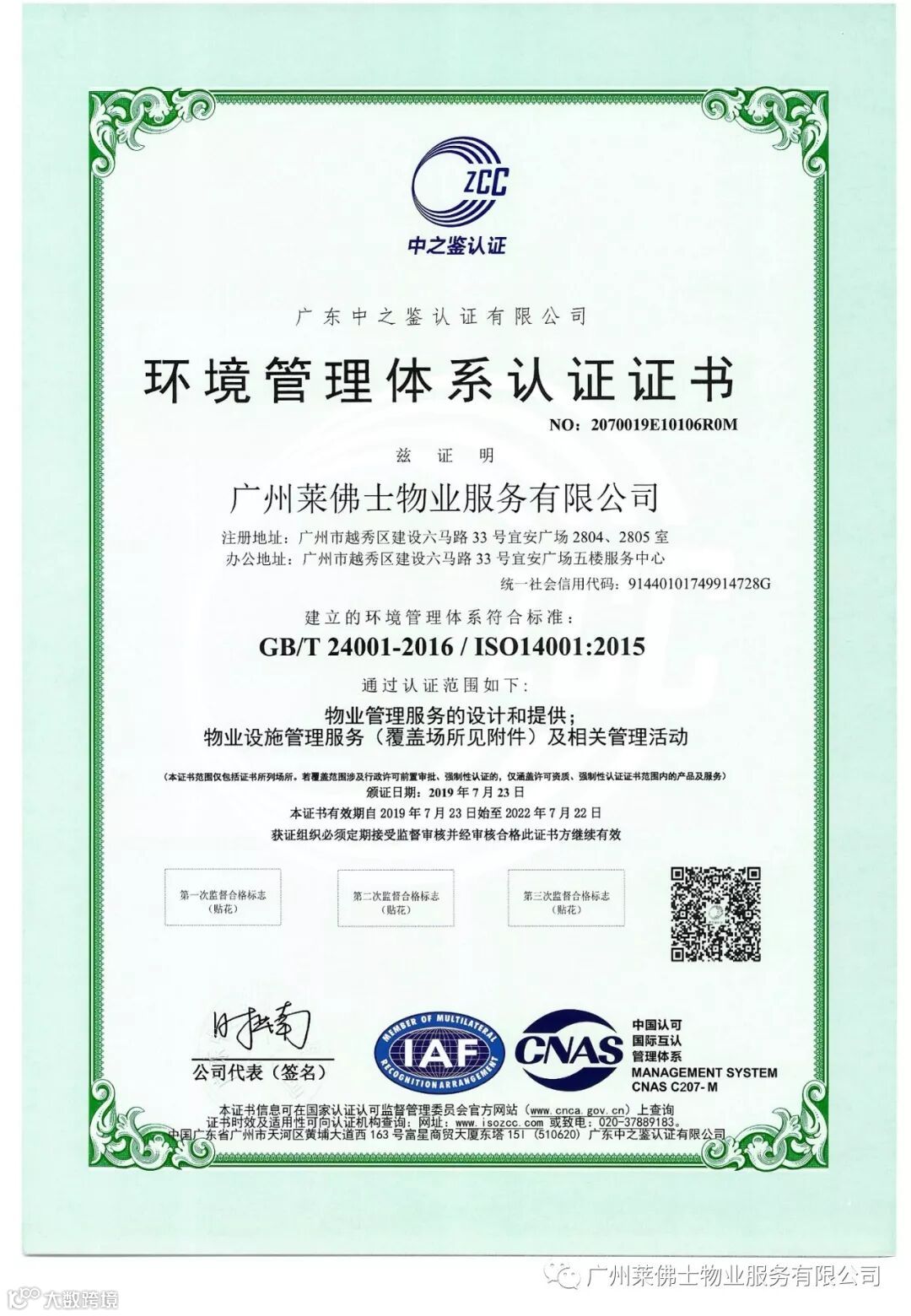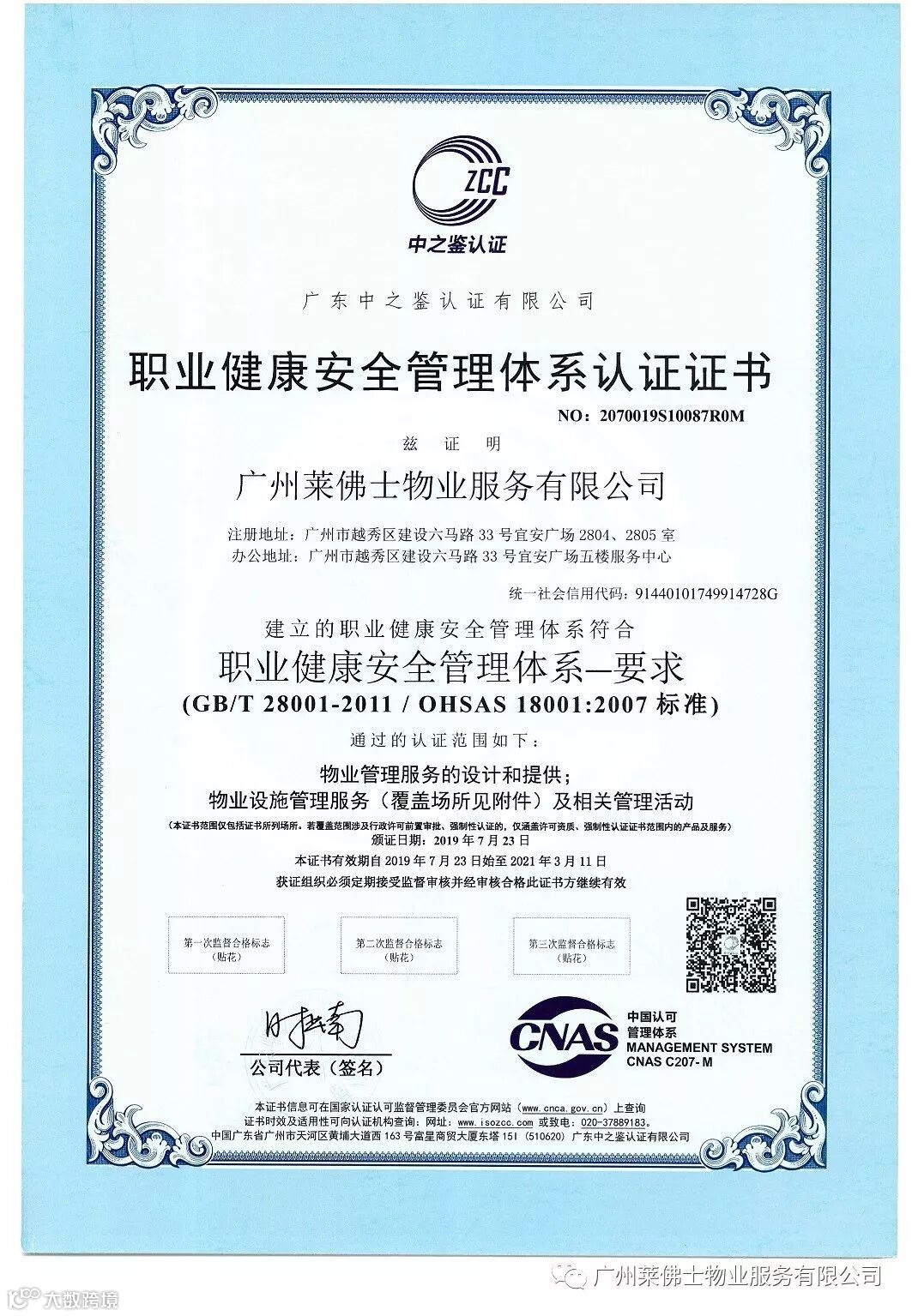近日,莱佛士物业成功通过权威认证机构的现场审核,经国家认证认可的监督委员会批准,公司在通过了国际质量管理体系(ISO9001:2015)监督认证的基础上,又成功获得了环境管理体系(ISO14001:2015)认证及(OHSAS18001:2007)职业健康安全管理体系认证证书,证实公司的体系运行符合认证标准要求,使莱佛士物业成功跻身“三体系”同步运行的管理企业之列,标志着公司综合管理水平又迈向一个新台阶。